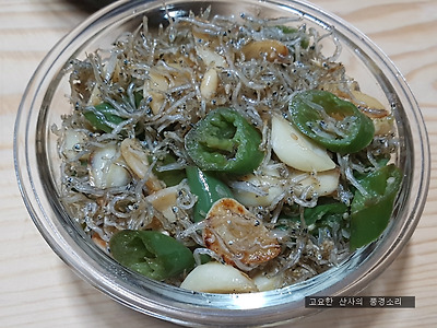 ▶ 재료 : 멸치 100g, 마늘 50g, 풋고추 2개, 진간장 2숟가락, 물 2숟가락, 꿀 2숟가락, 깨소금, 참기름, 콩기름 약간