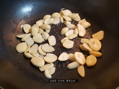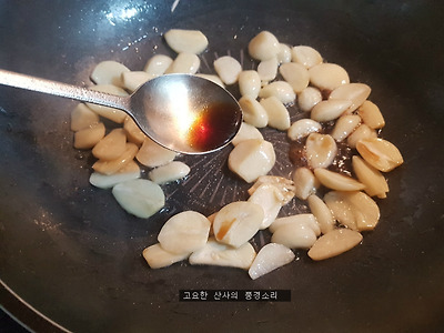 ㉡ 콩기름을 약간 두르고 마늘을 볶아준 후 간장과 물을 넣어준다.
