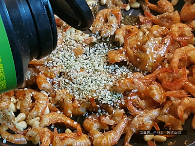 ▶ 재료 : 건새우 100g, 잣 50g, 진간장 2숟가락, 물 2숟가락, 꿀 2숟가락, 햄프씨드, 참기름 약간