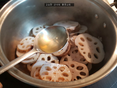 ㉣ 불을 끄고 꿀, 깨소금, 참기름을 넣고 마무리한다.
