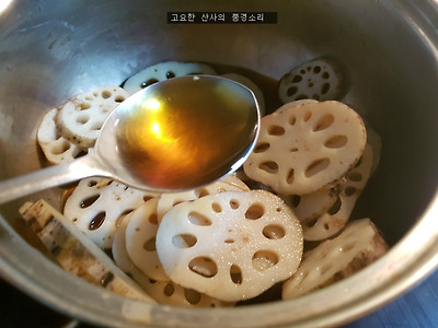 ▶ 재료 : 연근 100g, 진간장 3숟가락, 맛술 3숟가락, 매실진액 3숟가락, 도라지청 3숟가락, 물 3숟가락, 깨소금, 참기름 약간