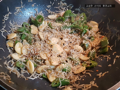 ㉢ 볶아둔 멸치와 썰어둔 풋고추를 넣어준다.