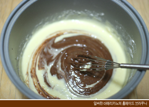 잘 녹인 초콜릿을 미리 만들어둔 반죽에 넣습니다. * 여기서 초콜릿이 다시 굳기전에 넣어주는 것이 중요합니다!