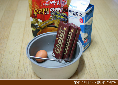 핫케익믹스, 우유, 계란1개, 초콜렛3개, 밥통, 거품기 |