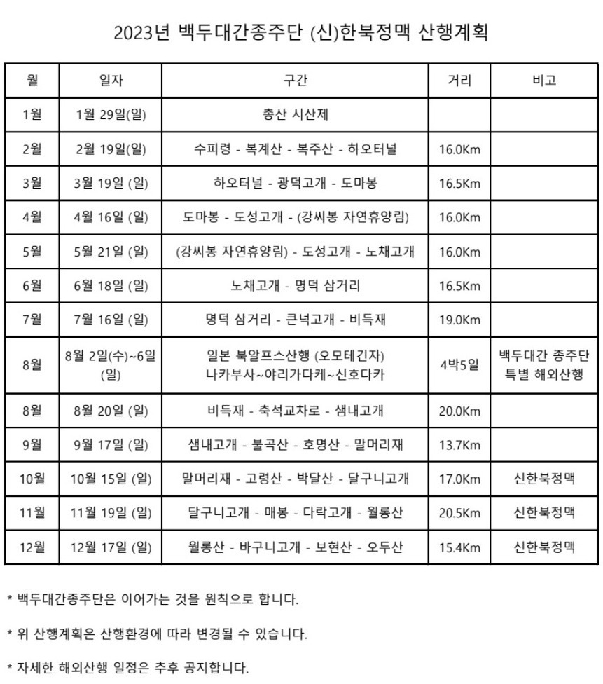 2023년 백두대간 종주단 산행 계획