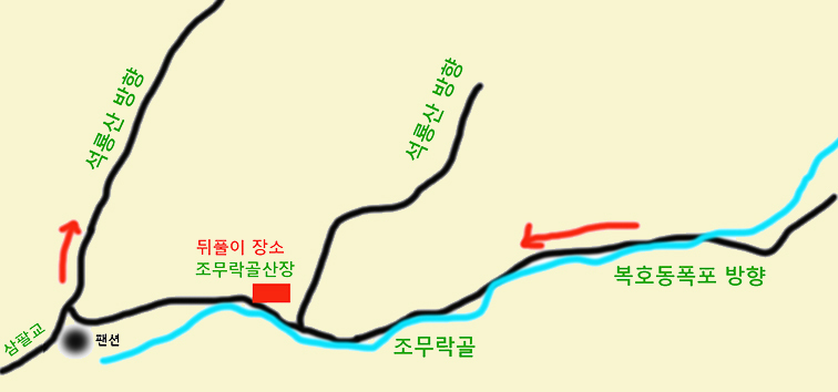 (들머리) 삼팔교 - 조무락골산장 갈림길(좌측 진행) - 1100봉 - 능선삼거리 이정목(도마봉 갈림길) - 석룡산 정상 - 방림고개(쉬밀고개) - 계곡 합류점(석룡산, 화악산 갈림길 이정목) - 복호동폭포 - 조무락골산장 - 삼팔교 (원점회귀)