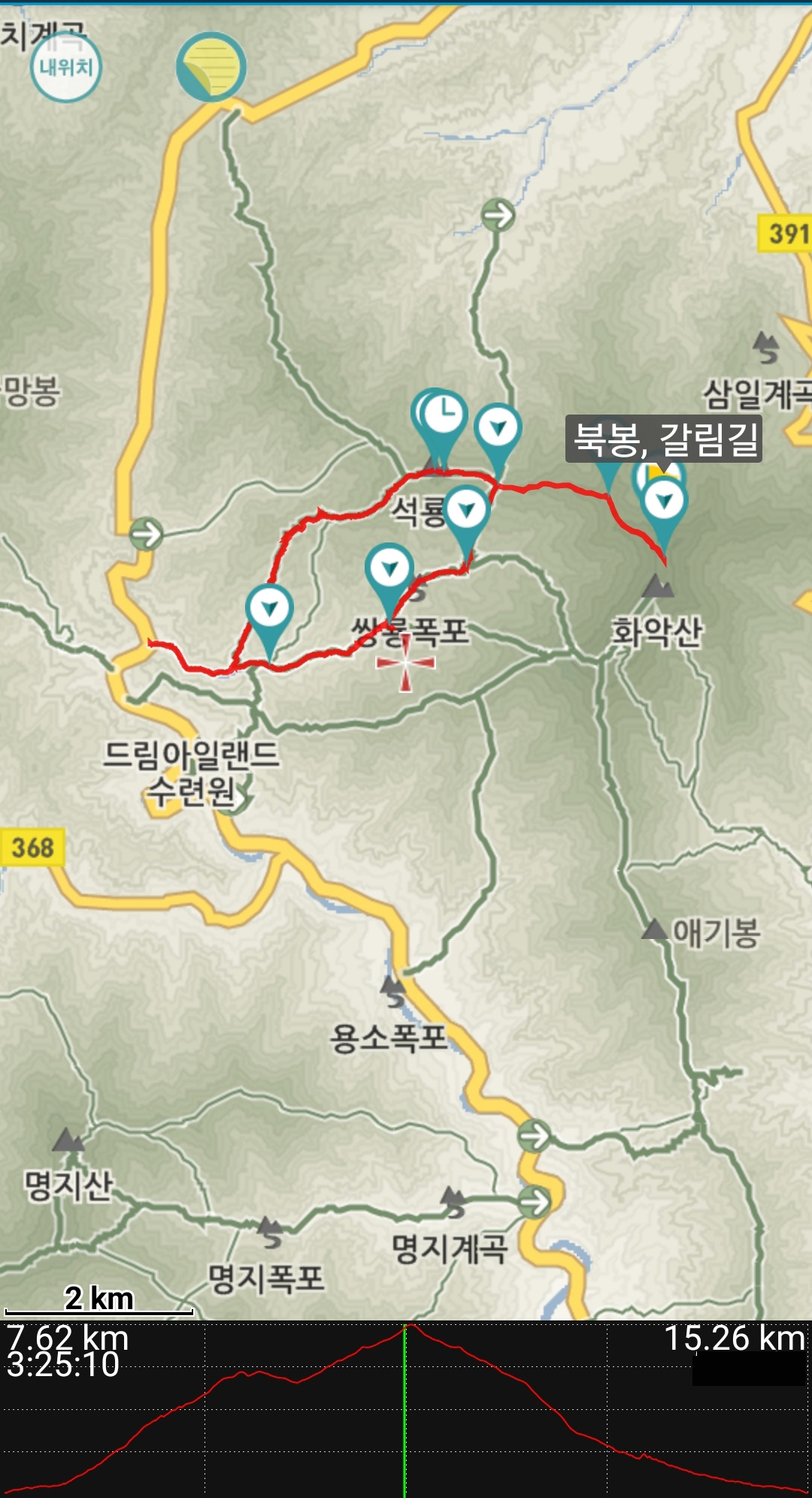 (들머리) 적목리 가림(약속의섬) ~ 언니통봉 ~ 애기봉 갈림길 ~ 화악산 중봉 ~ 애기봉갈림길 ~ 계곡 합류점(석룡산, 화악산 갈림길 이정목) ~ 복호동폭포 ~ 조무락골산장 ~ 삼팔교