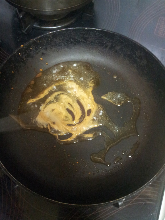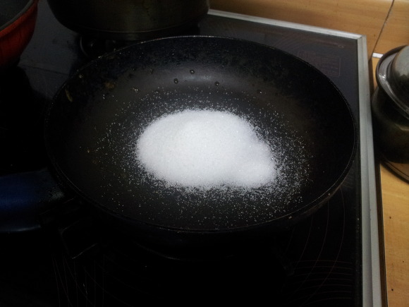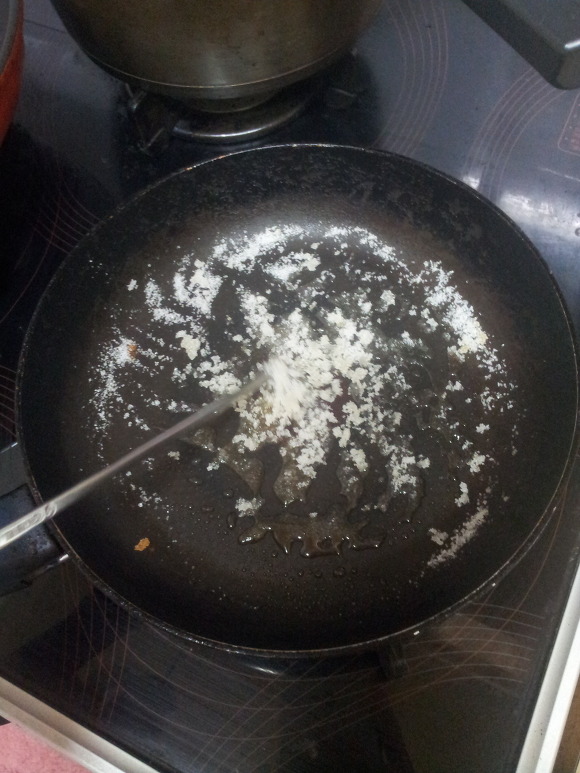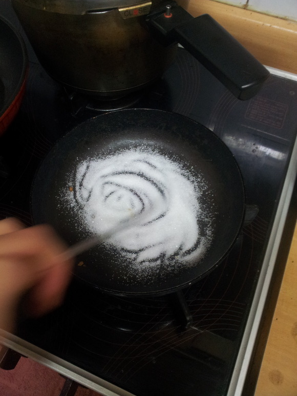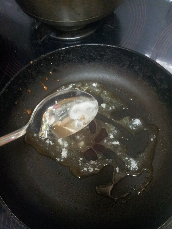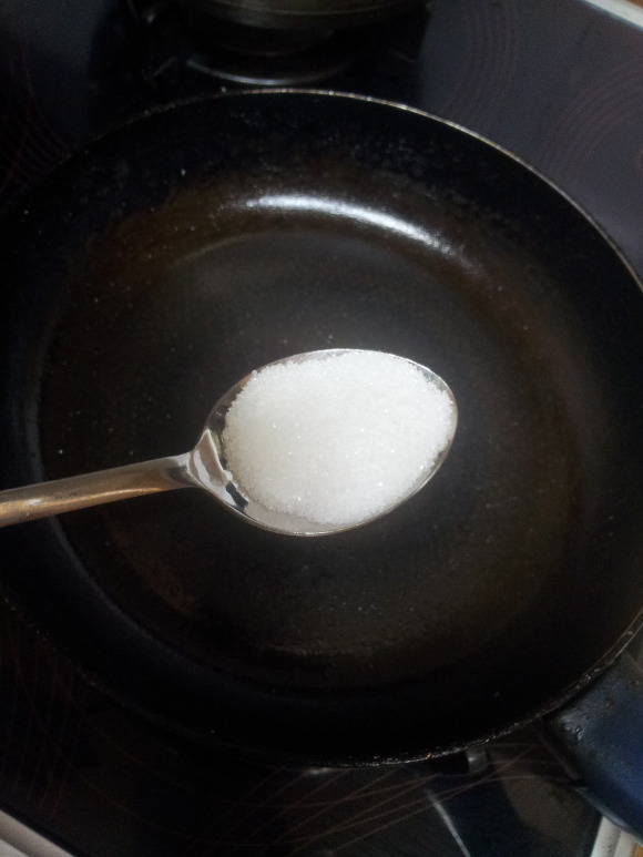 2. 숟갈 거의 꽉찰정도로 설탕을 X 3 ~ 5번 후라이팬에 넣음.