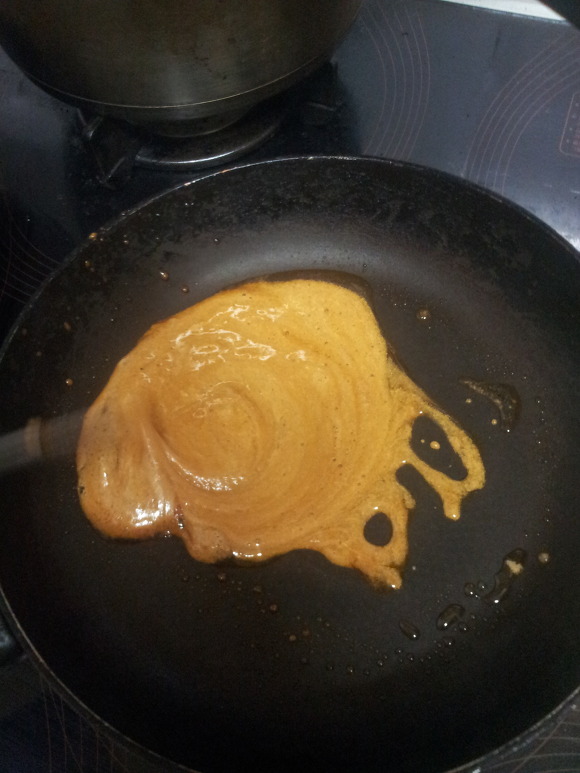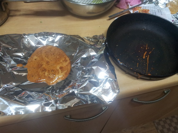 8. 이정도 색 나왔으면 바로 가스불끄고 준비한 호일에 숟가락으로 옮겨담음!