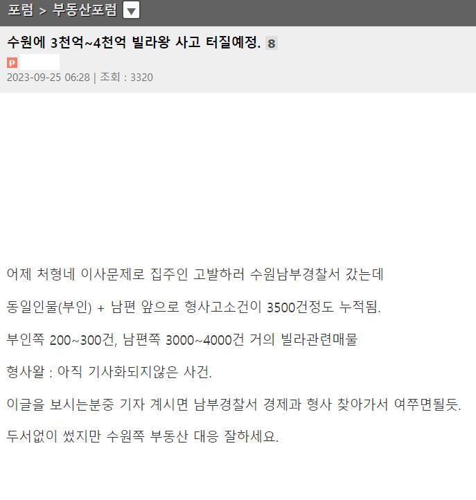 [스크랩] 이번에 수원 3천억~4천억 빌라왕 사고 크게 터질 예정 작성자소망의 빛|작성시간23.09.27|조회수21 목록 댓글 0 글자크기 작게가 글자크기 크게가 정말일까요 수원 사시는분들은 확인해보세요 수원에 3천억~4천억 빌라왕 사고 크게 터질 예정 출처 : https://ggoorr.net/thisthat/15997709 다음검색 스크랩 원문 : 생존21 - 지진,재난,전염병,전쟁,사고로부터의 생존 현재 게시글 추가 기능 열기 북마크 신고 센터로 신고 댓글 댓글 0 댓글쓰기 답글쓰기 댓글 리스트