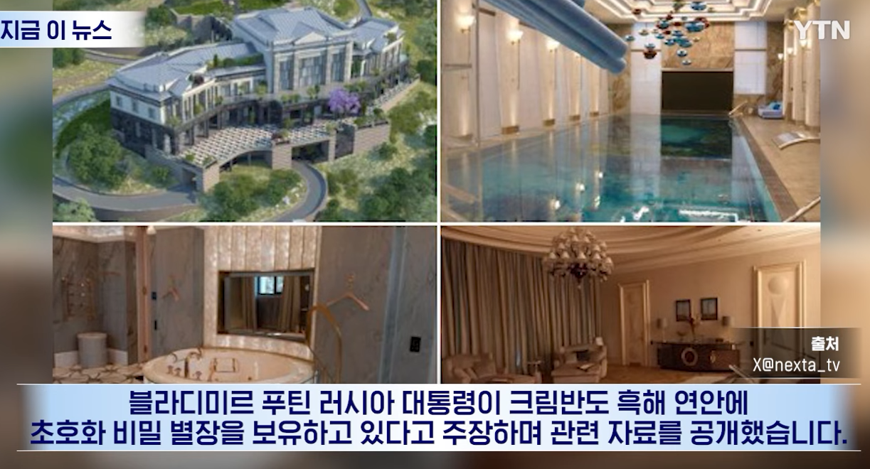 러시아의 반부패 활동가들이 블라디미르 푸틴 러시아 대통령이 크림반도 흑해 연안에 초호화 비밀 별장을 보유하고 있다고 주장하며 관련 자료를 공개했습니다. 별장에는 개인 의료 센터와 헬기 착륙장은 물론, 노화 방지를 위한 냉동치료 시설, 금도금 욕실 설비 등을 갖춘 것으로 알려졌습니다.