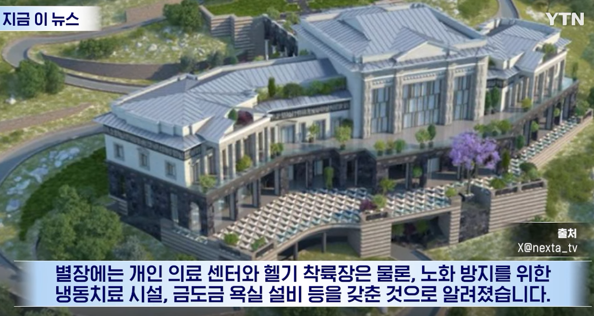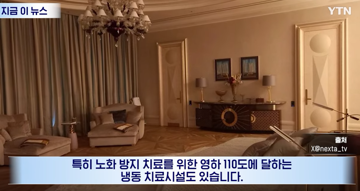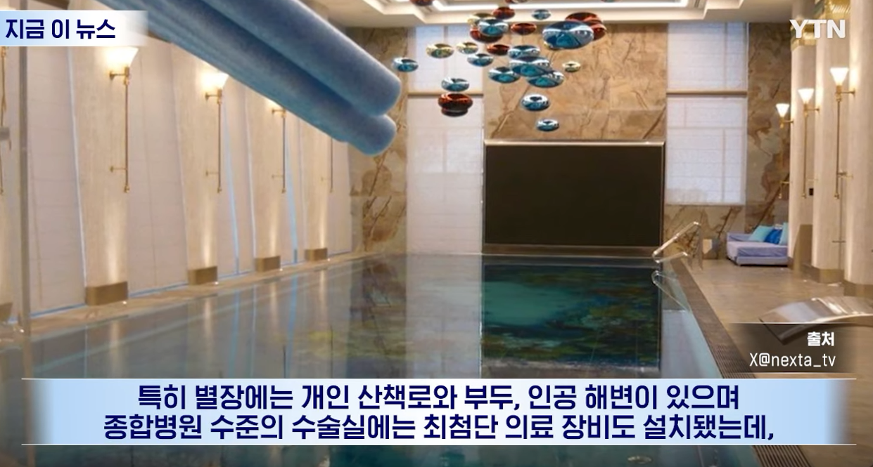 특히 별장에는 개인 산책로와 부두, 인공 해변이 있으며 종합병원 수준의 수술실에는 최첨단 의료 장비도 설치됐는데, 특히 노화 방지 치료를 위한 영하 110도에 달하는 냉동 치료시설도 있습니다.