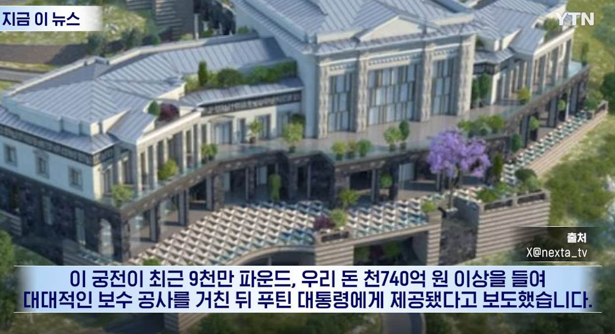 영국 더타임스는 러시아 반부패재단(FBK)이 폭로한 보고서를 인용해 이 궁전이 최근 9천만 파운드, 우리 돈 천740억 원 이상을 들여 대대적인 보수 공사를 거친 뒤 푸틴 대통령에게 제공됐다고 보도했습니다.