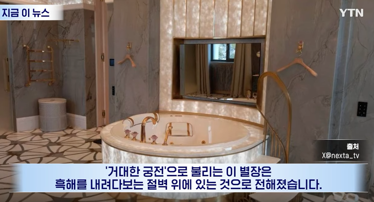 또 73평에 달하는 침실과 금 도금된 목욕탕이 있는 욕실도 마련됐습니다. '거대한 궁전'으로 불리는 이 별장은 흑해를 내려다보는 절벽 위에 있는 것으로 전해졌습니다.