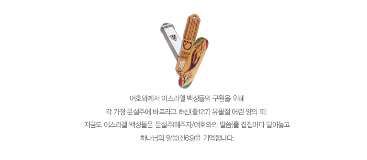 이스라엘의 문설주, 메주자에는 ‘들으라 이스라엘’의 의미로 ש이라는 글자가 새겨져 있습니다. "그 말씀들을 네 집 문설주(메주자)들과 네 대문에 써 붙여야 한다" (신6:9) 그리고 메주자안에는 메주자 안에는 성경의 신명기 6장 말씀이 들어있습니다. 메주자는 오직 한분이신 여호와 하나님을 생각하며 하나님의 사랑을 깨닫게 하는 데 목적이 있습니다. 그래서 이스라엘 백성들은 들어오고 나가며 문설주에 손을 대고 입을 맞춥니다. 말씀이신 하나님을 경외하는 마음으로 입을 맞추는 것입니다.