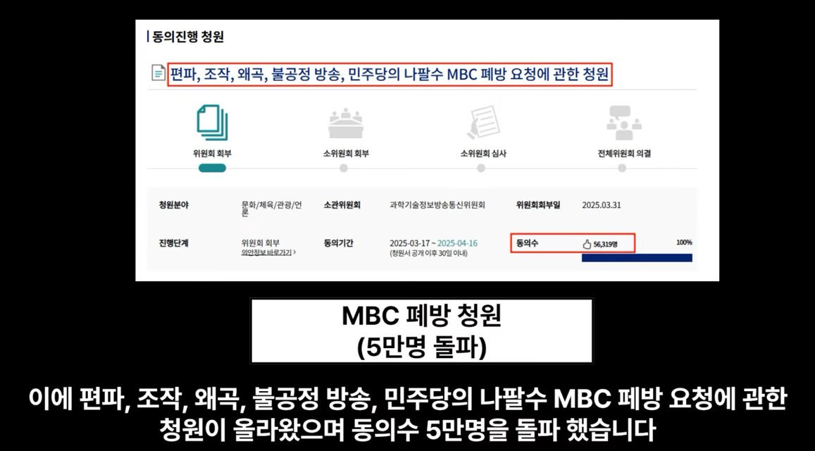 MBC 폐방각! 폐방 청원 5만명 돌파. 이진숙 방통위원장, 결단 남았다! 작성자소망의 빛|작성시간25.04.01|조회수99 목록 댓글 0 글자크기 작게가 글자크기 크게가 다음검색 현재 게시글 추가 기능 열기 북마크 공유하기 신고 센터로 신고 댓글 댓글 0 댓글쓰기 답글쓰기 댓글 리스트