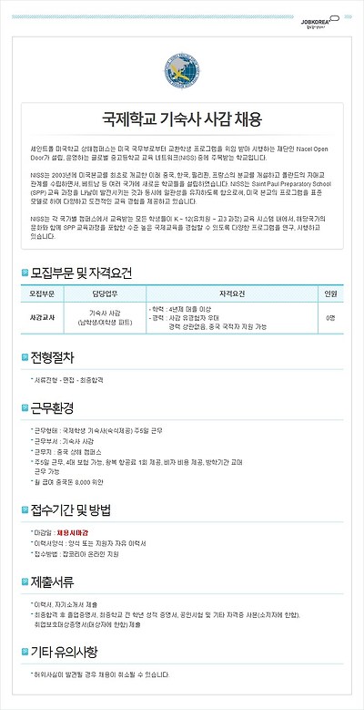 ㈜영어포럼 : 상해 국제학교 기숙사 사감(남/여)(~02/23) 작성자ylull|작성시간18.01.25|조회수173 목록 댓글 0 글자크기 작게가 글자크기 크게가 자세한 채용공고 확인>> http://joburl.kr/SkpNV << 본 채용정보는 좋은 일자리를 찾으시는 분을 위해 잡코리아가 드리는 정보입니다. 자세한 채용공고 확인>> http://joburl.kr/SkpNV << 다음검색 현재 게시글 추가 기능 열기 북마크 공유하기 신고 센터로 신고 댓글 댓글 0 댓글쓰기 답글쓰기 댓글 리스트