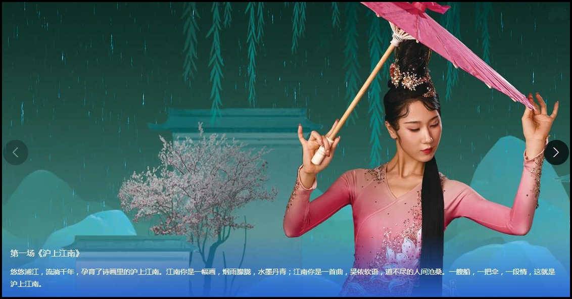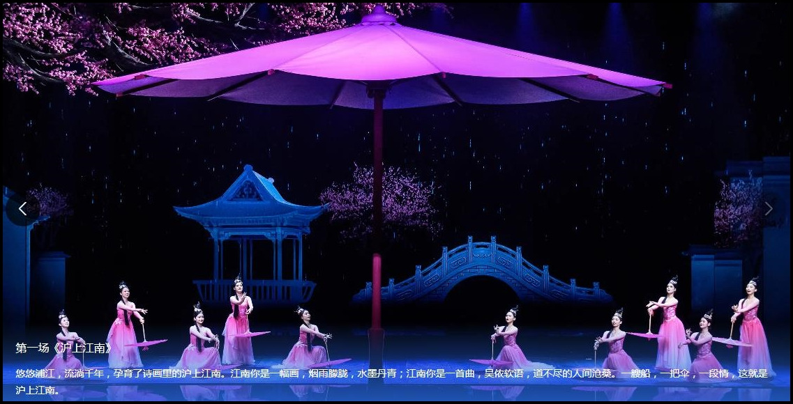 第一场《沪上江南》悠悠浦江,流淌千年,孕育了诗画里的沪上江南。江南你是一幅画,烟雨朦胧,水墨丹青;江南你是一首曲,吴侬软语,道不尽的人间沧桑。一艘船,一把伞,一段情,这就是沪上江南。