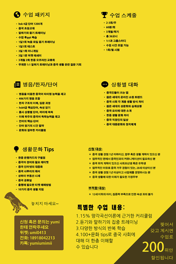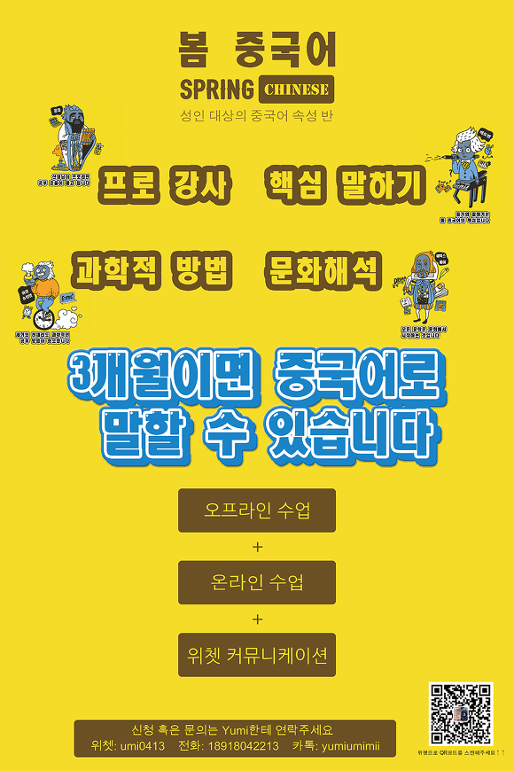 더 많은 교민 여러분들께 상하이 생활에 대해 알려 드리고 중국어를 가르쳐 드리고 싶습니다. 포스터의 연락처로 많은 연락 부탁드립니다~