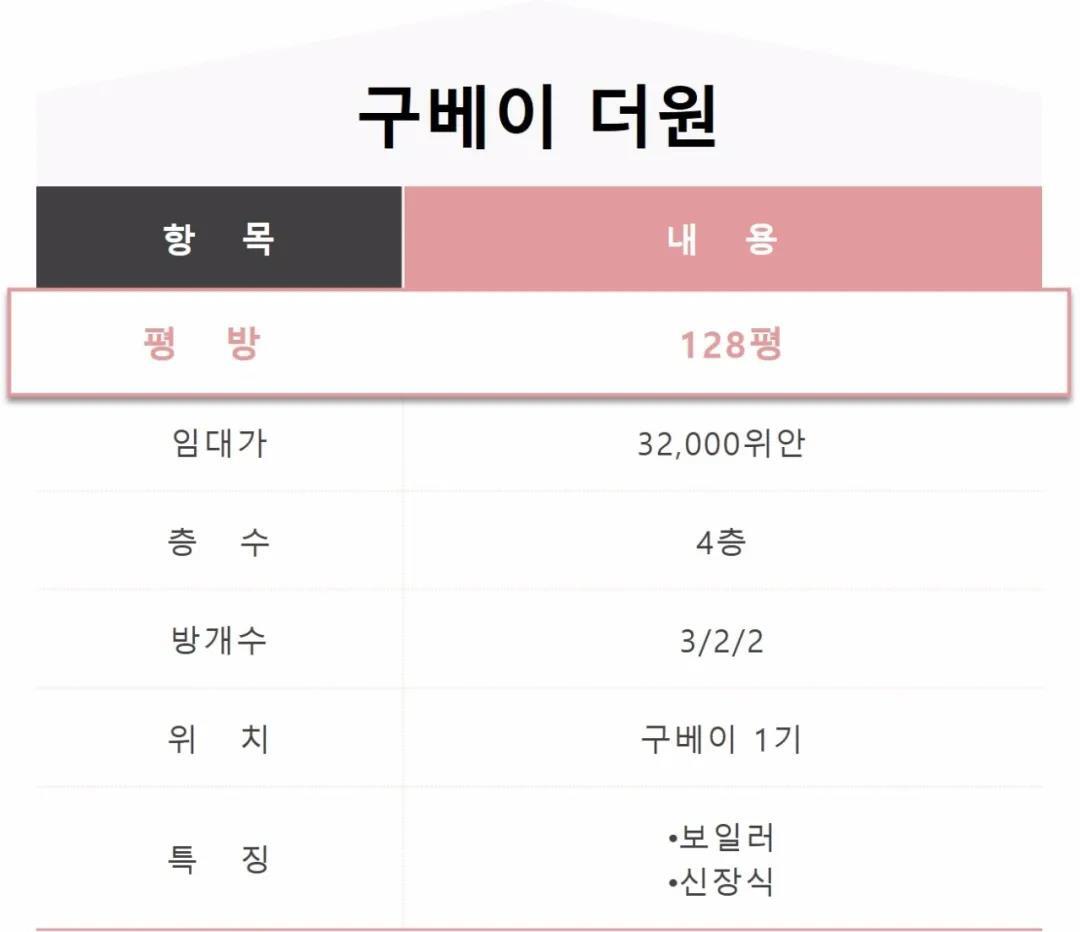 [구베이1기]【 코리아 임대】구베이 더원, 구베이 1기, 128평, 32,000위안, 방3개, 4층, 보일러, 신장식