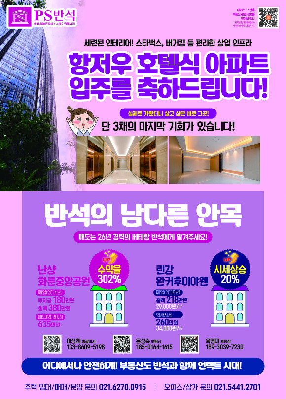 [반석부동산] 항저우 호텔식 아파트 입주를 축하드립니다! 작성자반석부동산|작성시간20.07.06|조회수58 목록 댓글 0 글자크기 작게가 글자크기 크게가 !! 마지막 3채의 기회가 있습니다 !!_ 세련된 인테리어_ 스타벅스, 버거킹 등 편리한 상업 인프라_ 실제로 가봤더니 살고싶다고 말하는 그곳어디에서나 안전하게! 부동산도 반석과 함께 언택트 시대! 다음검색 현재 게시글 추가 기능 열기 북마크 공유하기 신고 센터로 신고 댓글 댓글 0 댓글쓰기 답글쓰기 댓글 리스트