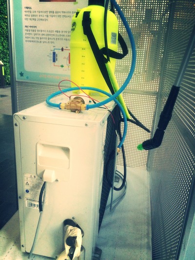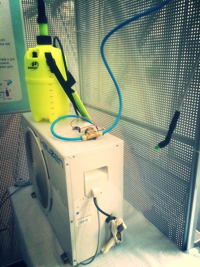 에어컨 실외기 뒷편에 물을 뿌려주어 냉방 효율을 높일 수도 있고