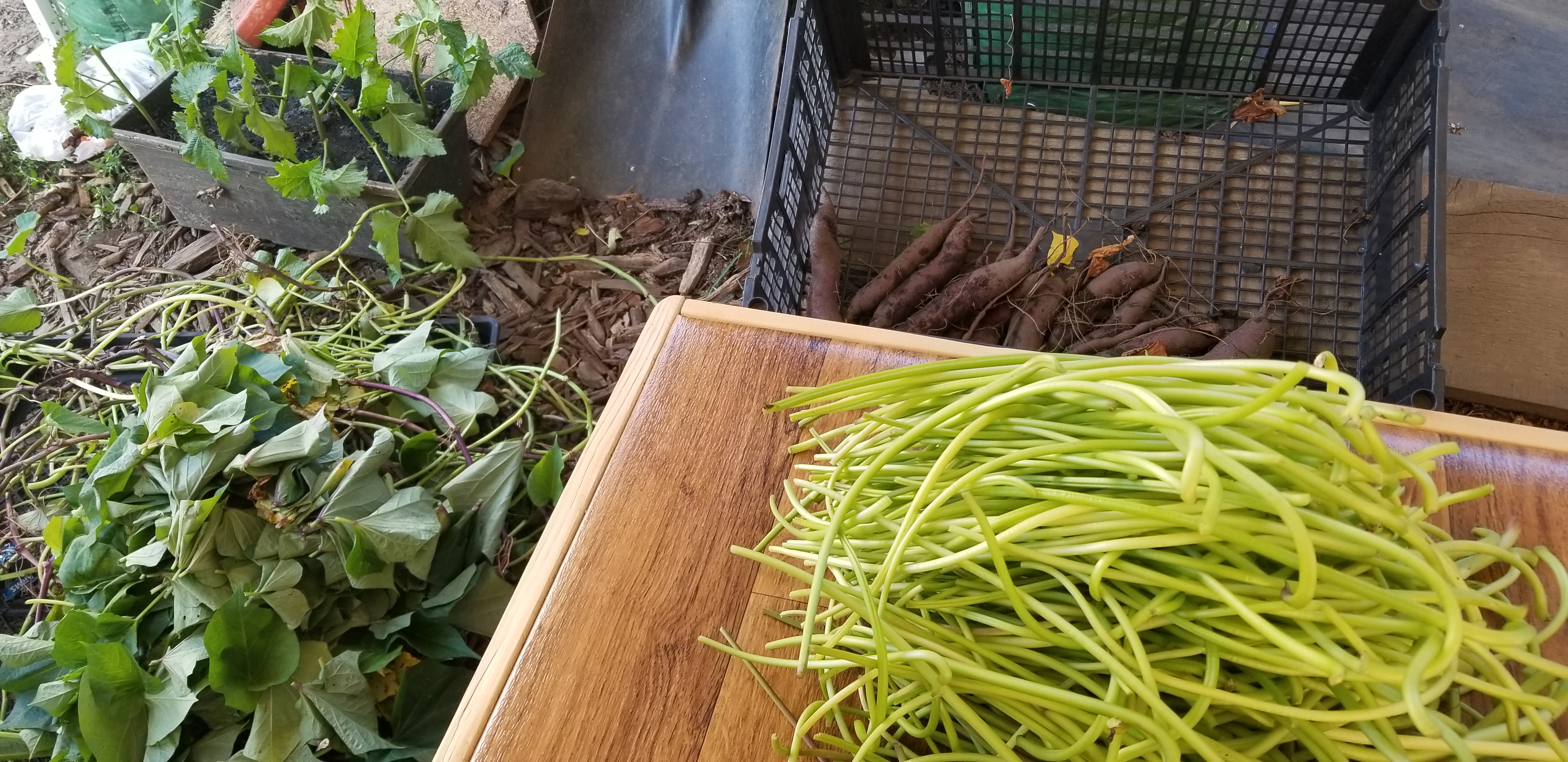고구마 줄기에서 잎 줄기를 따고, 또 잎은 제거 해 줬습니다.