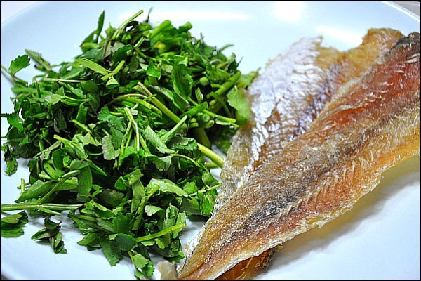 [재료] 미나리, 명태포, 밀가루, 물, 부침기름