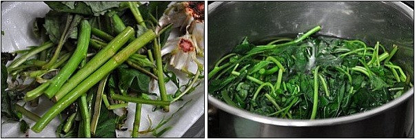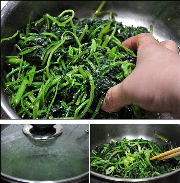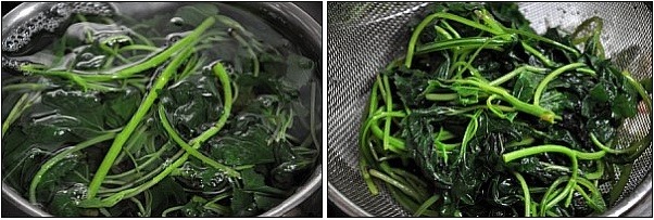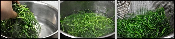 (줄기가 굵은나물은 줄기먼저 넣고 잠시 있다 잎을 담구어 데친다.)
