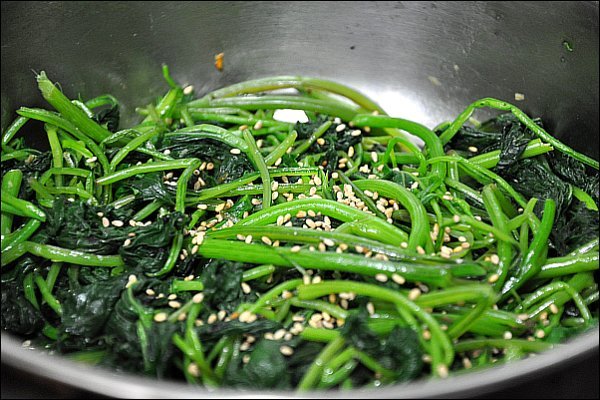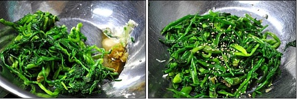 끓는물에 나물을 넣었다가 바로 건져서 차가운 물에 씻은후에 물기를 짠다.