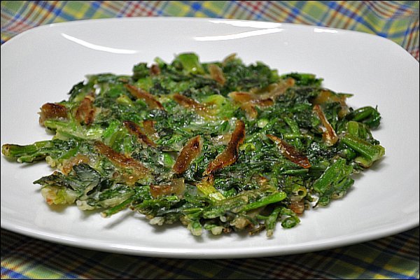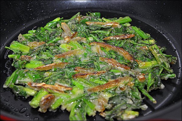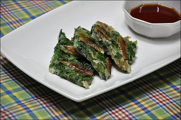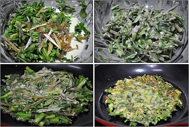 아래는 데치지 않은 미나리로 부침을 만들었어요.