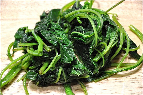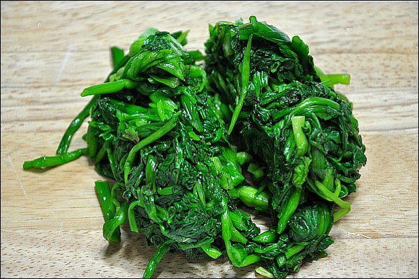 데친나물은 물기를 대충 짠뒤에 먹기좋은 길이로 자른다.