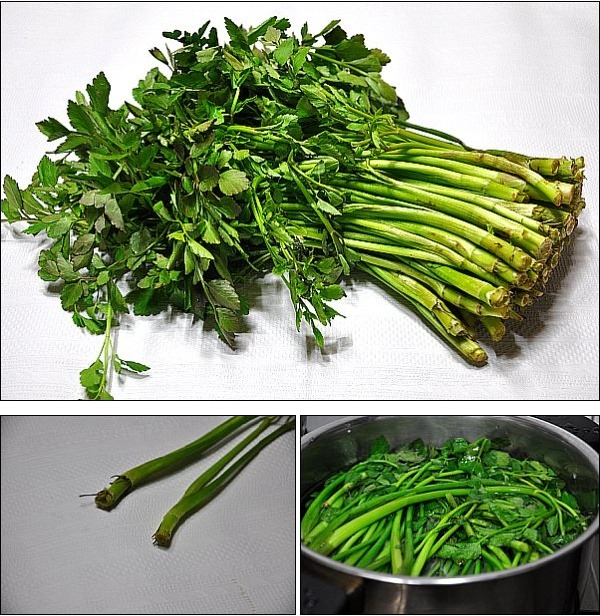 미나리는 끝을 잘라내고 마디부분에 나온 뿌리를 잘른뒤에 시든잎을 떼어내고,