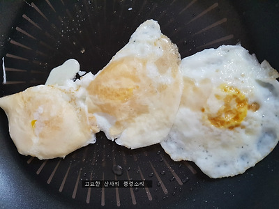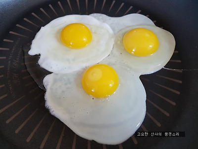 ㉠ 프라이팬에 식용유를 약간 두르고 오골계 계란을 올려 구워준다.