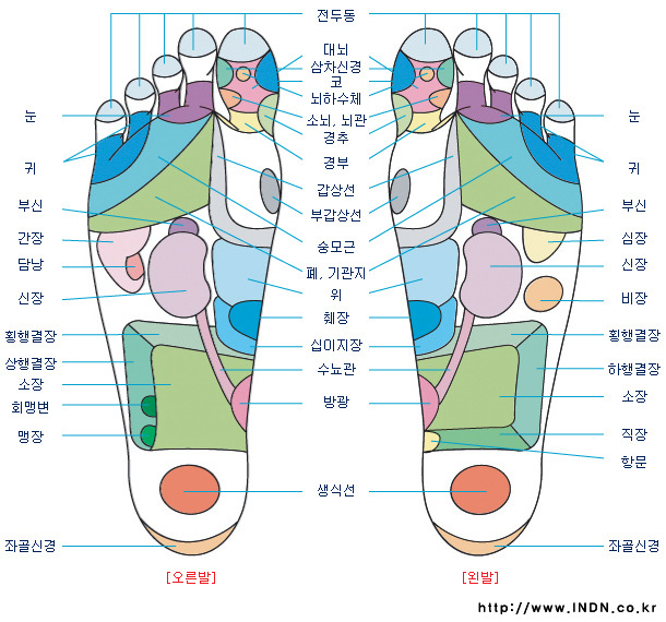 새끼발가락: 신장, 방광 - 새끼발가락을 문질러주면 빠른 시일에 효과를 볼 수 있다. 새끼발가락은 작은 뇌라고 불릴 정도로 뇌와 많이 연결되어 있으므로 시험공부, 장기간의 정신활동 후에 자극해주면 피로 회복에 좋다...
