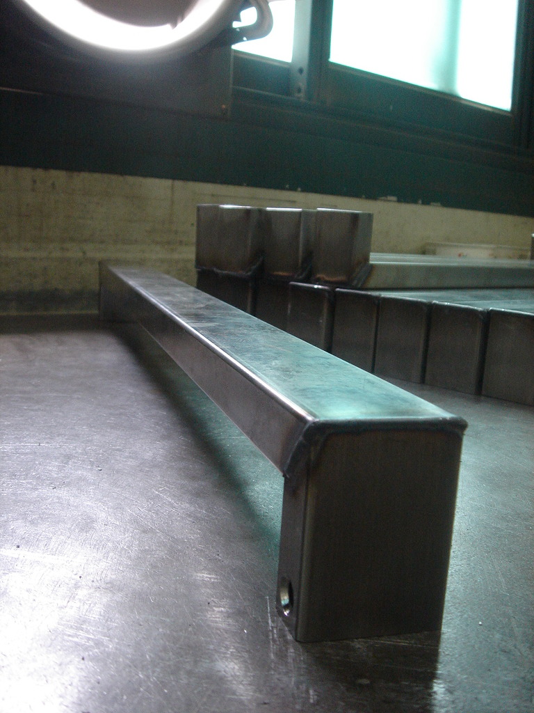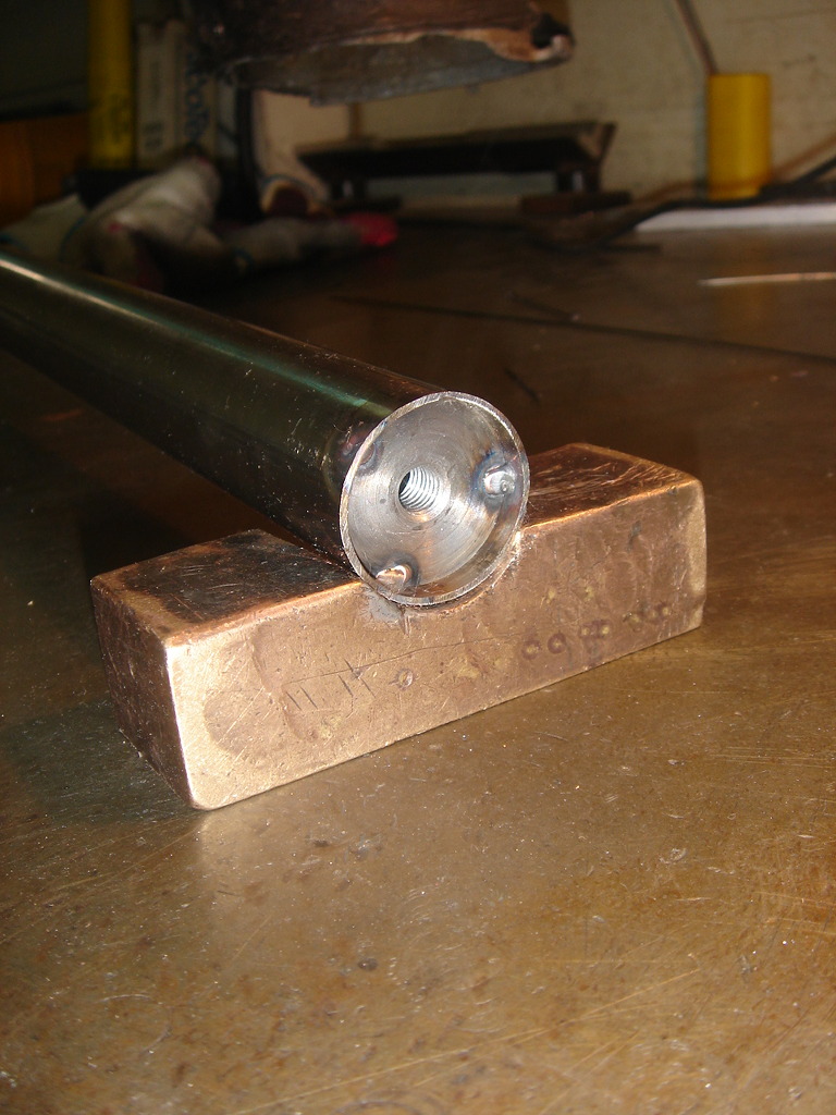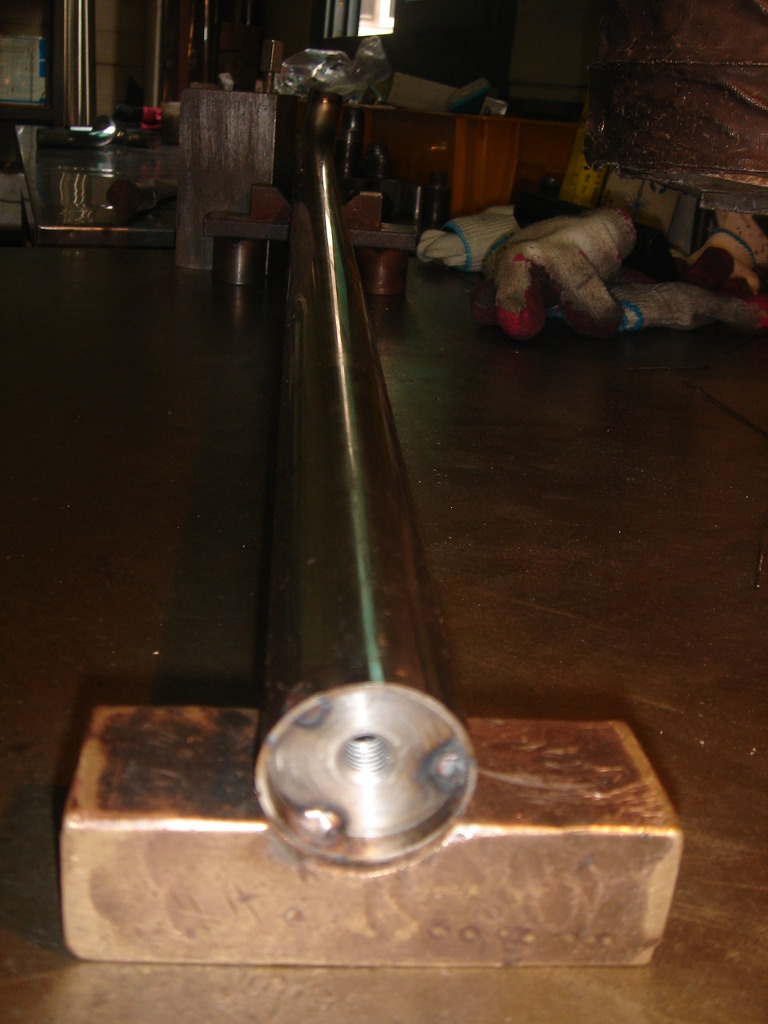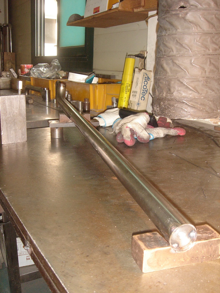 이것은 Φ 32 1.2t 스텐레스304 원형파이프 도어핸들입니다. 안에 뽕(?)-회사에서 이렇게 부릅니다- 을 집어 넣고 용접을 해야 합니다. 초보 용접사에게는 다소 난이도가 있는 용접입니다. 파이프가 순식간에 녹아서 구멍이 생기기 쉽습니다. 물론 구멍이 나면 나중에 용접봉을 사용해서 떼워 주면 되지만 광내는 분들이 싫어라 하십니다.ㅎㅎ 과감하게 용접을 하시면 됩니다. 고수 분들이야 다들 아시겠지만 팁을 한가지 알려 드리면, 바로 용접하는 부위가 철판이나 열전도율이 높은 구리,동판등에 밀착이 되면 열이 분산이 되기 때문에 훨씬 여유롭게 혹은 구멍이 날까 하는 심리적 압박에서 덜 부담스럽게 용접을 하실 수 있습니다.