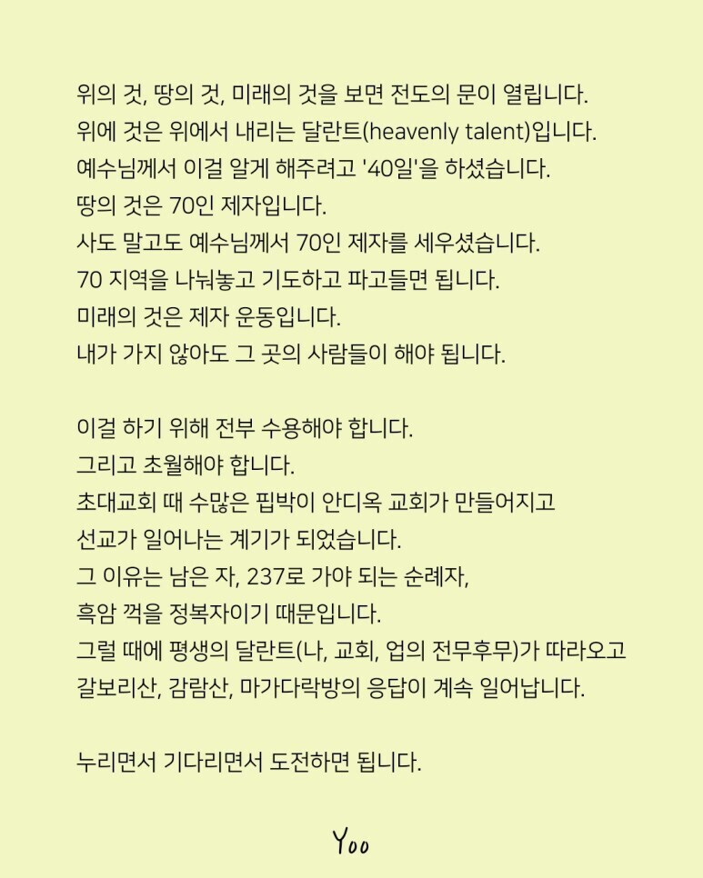 우리에게는 ‘복음 달란트’가 필요합니다. 예를 들어 여호와께서 요셉과 함께하시므로 범사에 형통케 하심을 보았다고 했습니다. 여러분이 여기서 받을 응답 세 가지가 있습니다. Heavenly Talent이기 때문에 ‘위의 것’을 보고 다른 사람에게 보게 해 주는 것입니다. 이것을 알게 해 주려고 감람원에서 40일, 마가 다락방에서 10일 동안, 예배 때(사도행전 2:42), 날마다 이 축복을 기도로 누린 것입니다. 그다음으로 ‘땅의 것’을 보아야 합니다. 그것이 바로 70제자, 70지역, 70장로, 70나라를 세우는 것입니다. 여기서 ‘70’은 한 사람이 줄 수 있는 영향력입니다. 마지막으로 ‘미래의 것’을 보아야 하는데 내가 가지 않아도 그들이 제자운동을 할 수 있도록 하는 것입니다. 이것은 처음이요, 마지막이요, 영원한 것입니다. 이렇게 세 가지를 보면 전도의 문이 열리게 됩니다. 이것을 하기 위해서는 3단계가 나와야 합니다.
