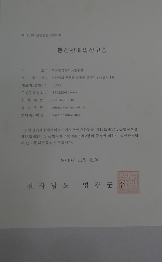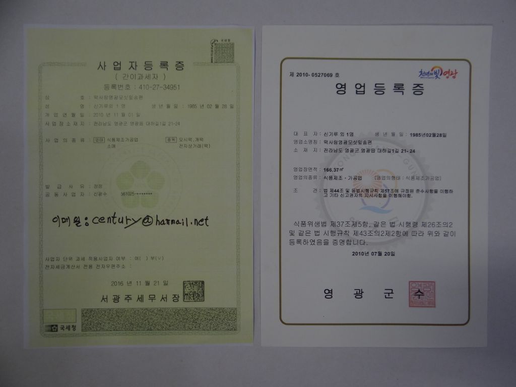 2) 농장주 주소 및 원산지:영광군영광읍 대하길1길21-24/국내산(동부.기피 영광산)수입산(동부.기피 미얀마)깨(중국)