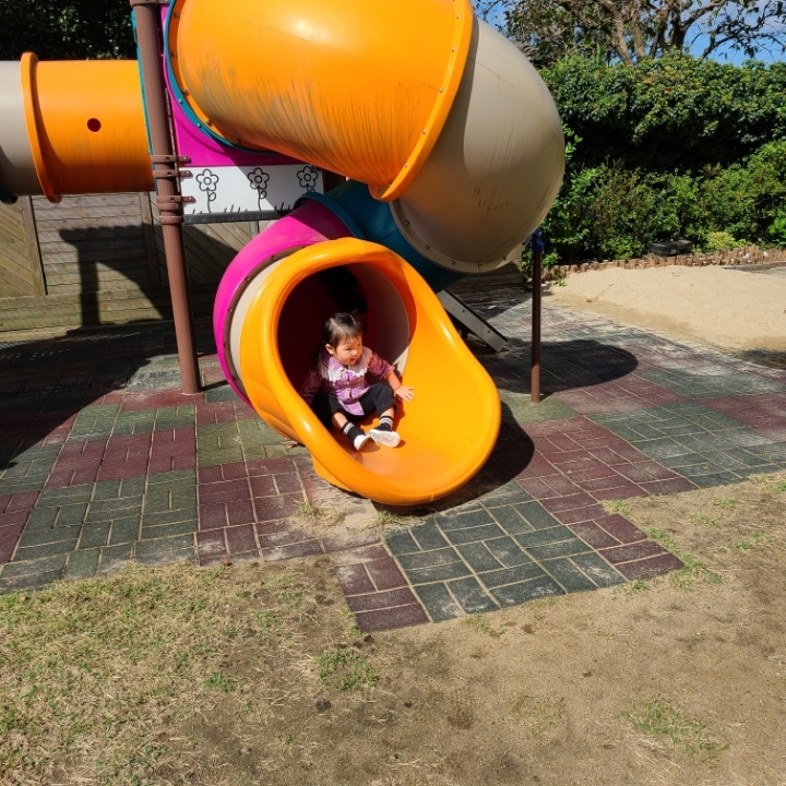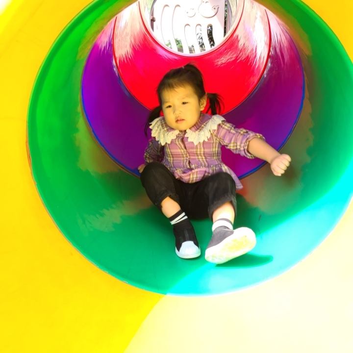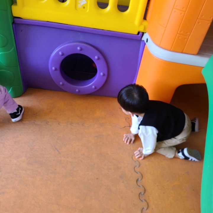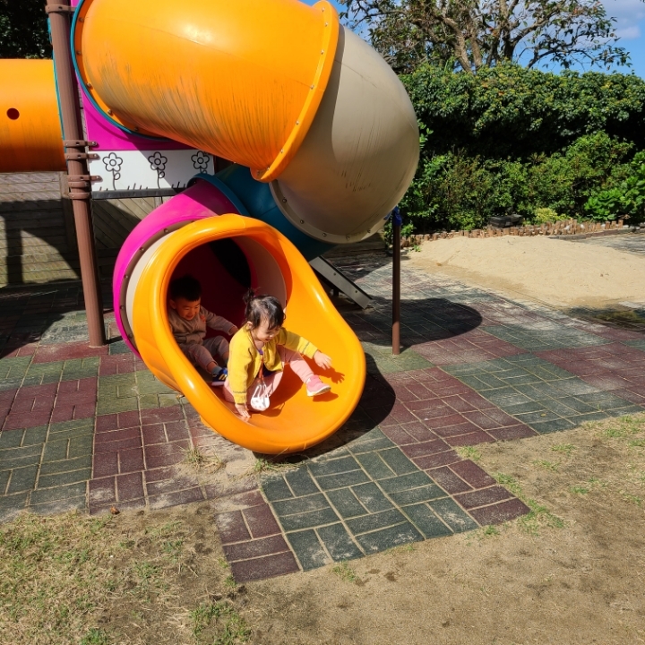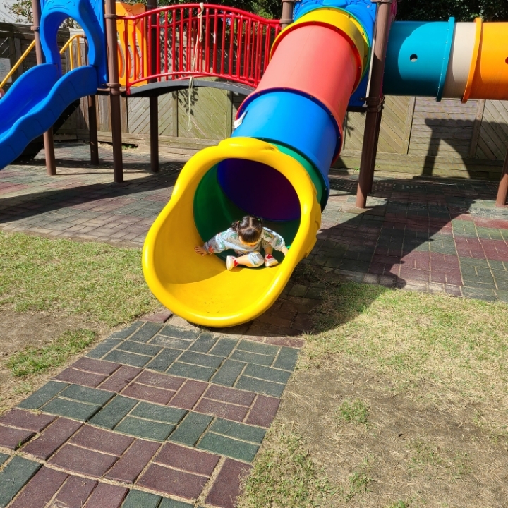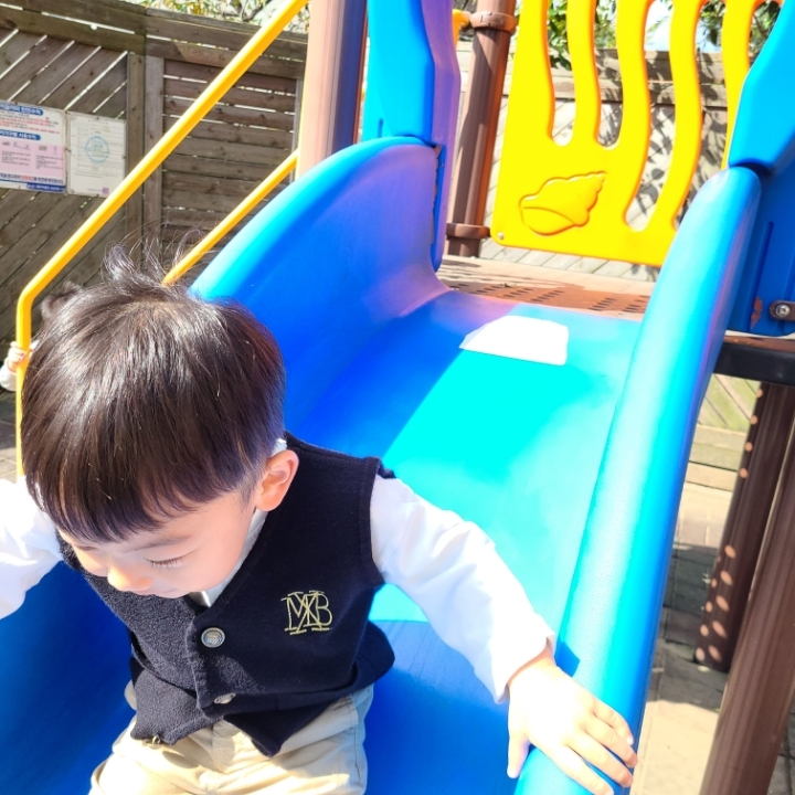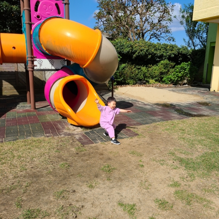 터널 미끄럼틀이 무섭지도 않은지 신나게 슝~하고 타고, 시원한 정자에서 가을 열매 책도 함께 보았답니다~😊