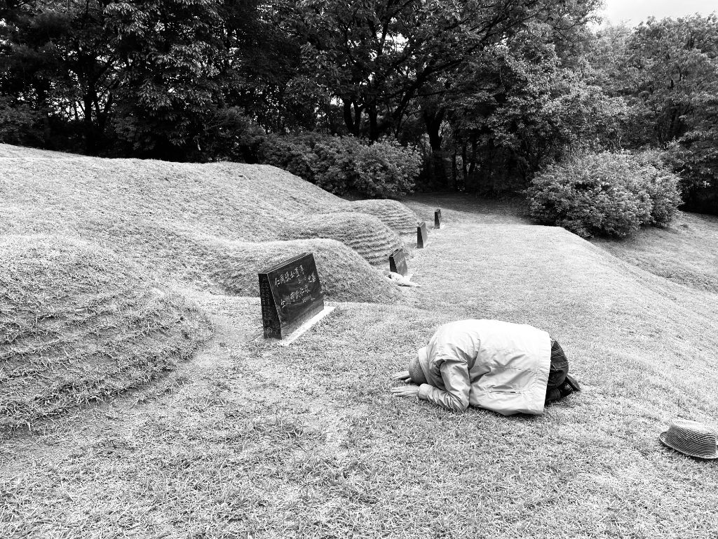 (무위당 선생님 묘소에서 관옥 선생님/ 사진: 류하, "7분 남짓 엎드려 절하셨어요.")