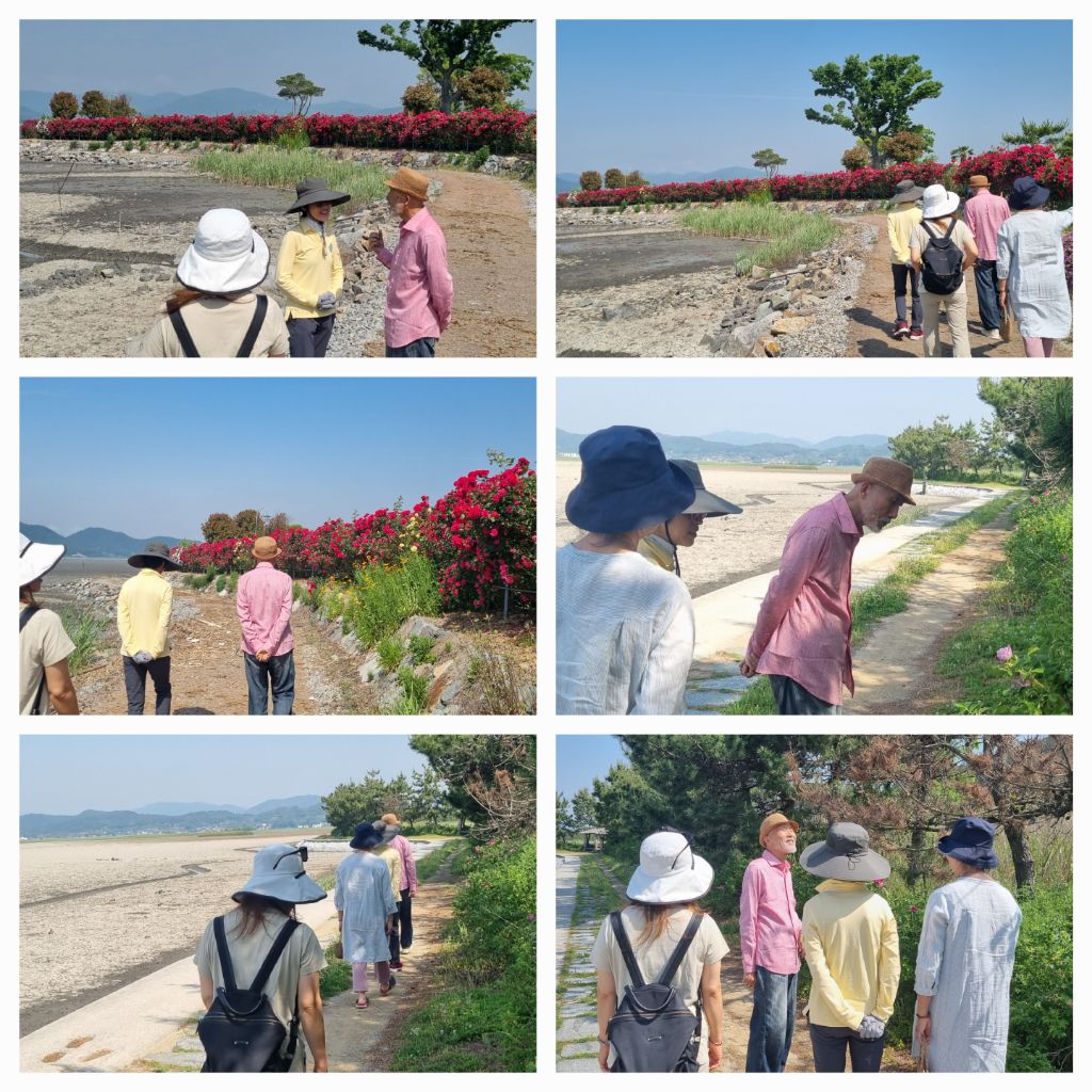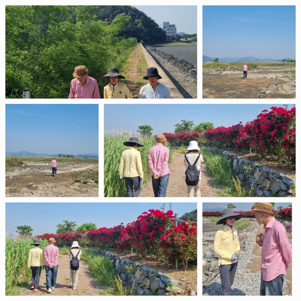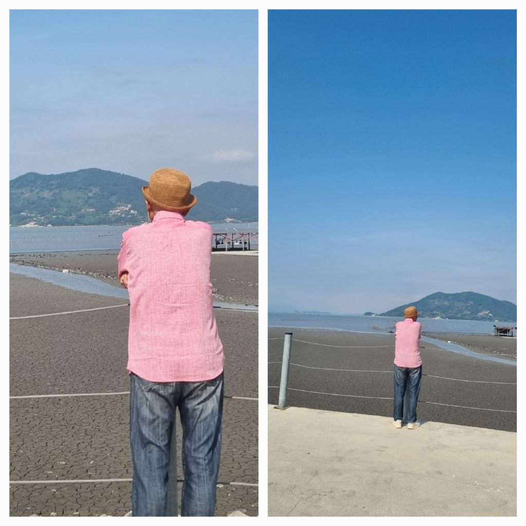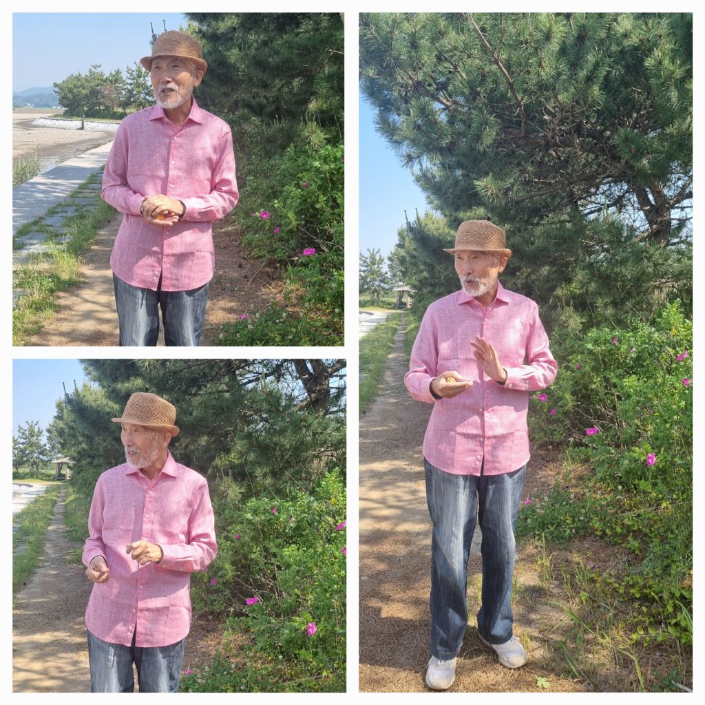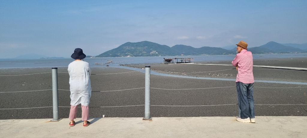 선생님과 효선이 함께 길을 걷습니다. 와온 바다를 끼고 순천만으로 향해 걷습니다. 분홍색 셔츠와 옅은 푸른색 셔츠를 차려입고 오신 - 부쩍 건강해진 모습 - 두 분의 모습이 정겹습니다.
