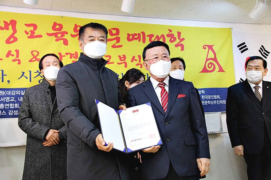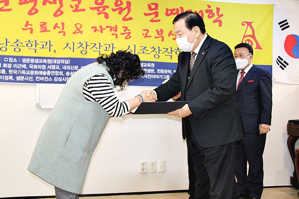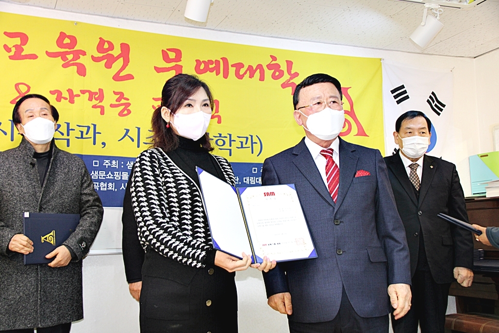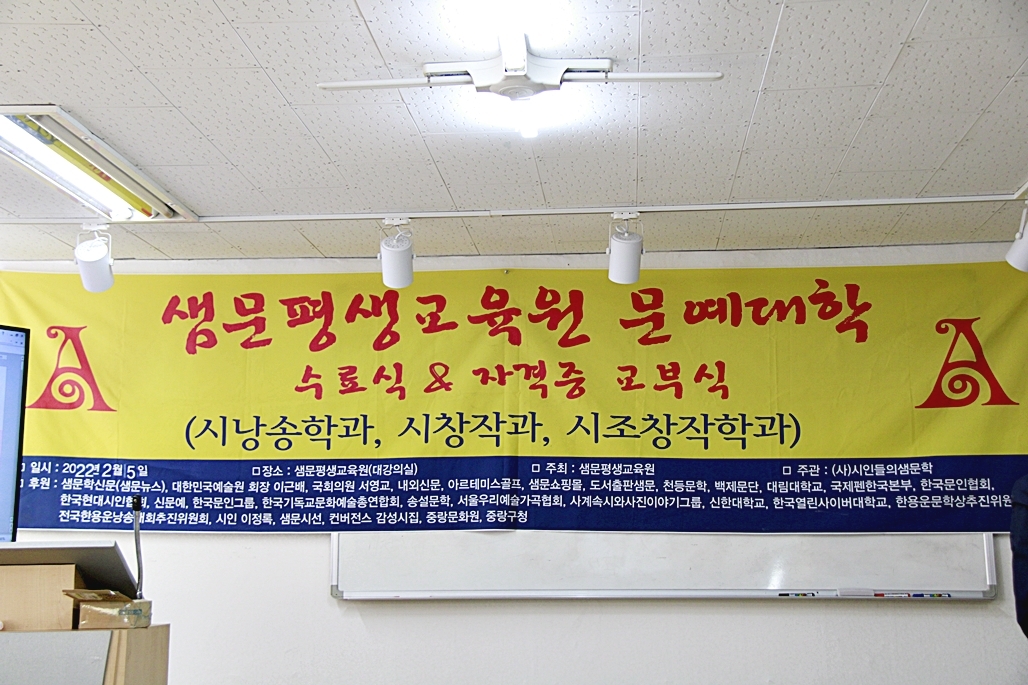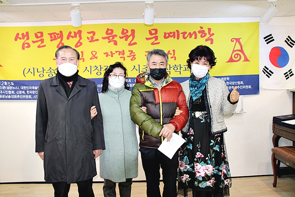 사단법인 문학그룹 샘문 신년하례식, 임원 위촉식, 자격증 교부식 & 샘문사이버교육원 샘문대학 수료식, 백일장 시상식이 2022년 2월 5일(토) 오후 1시부터 샘문그룹 부설 샘문사이버교육원 대강의실에서 사단법인 문학그룹 샘문 주최, 샘문사이버교육원 주관으로 성황리에 개최 되었다.