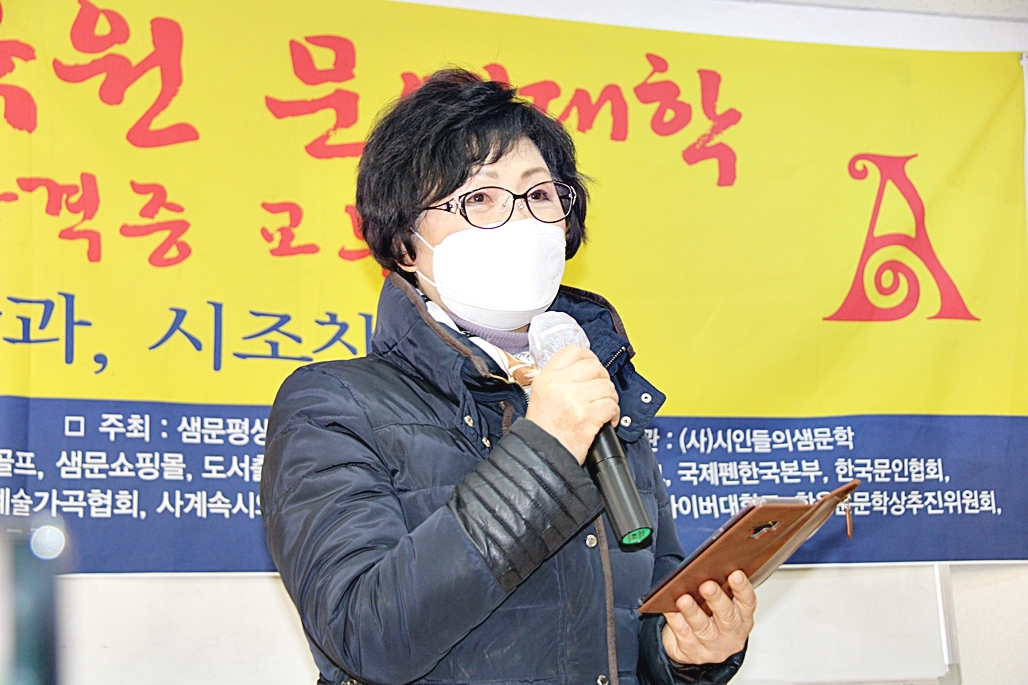 다음 순서로 샘문사이버교육원 샘문대학 제10기 수료생들의 자작시 발표가 있어, 정희오, 박봉황, 이연수, 김정자, 문수점 님들 순으로 자작시 발표를 들었다.