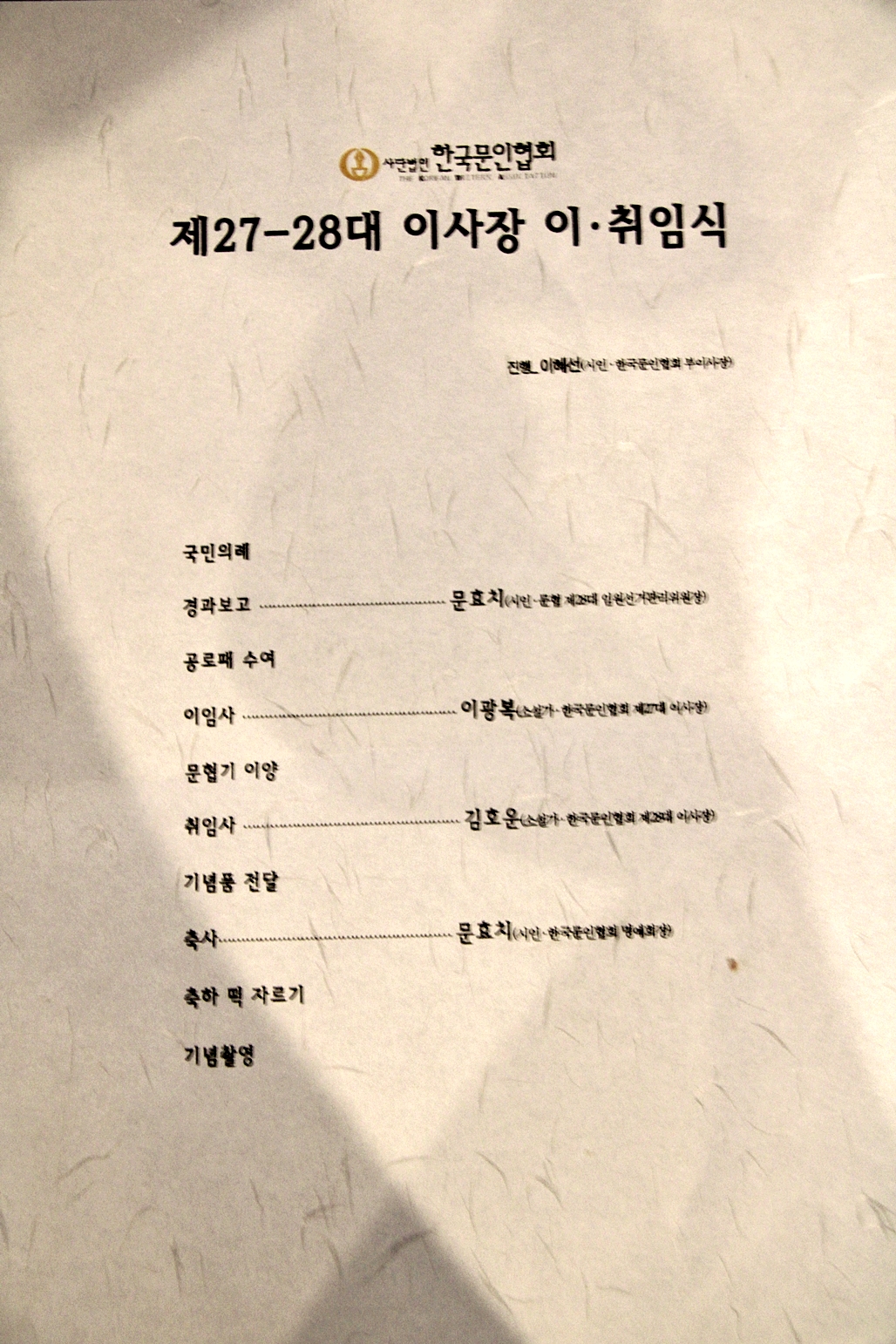 이어서공로패 수여로 이광복 이임 이사장이 그간 함께하며 공로가 큰 임원들에게 공로패를 수여하였다. 이어서 이광복 27대 이사장은 이임사를 가슴에서 울어나오는 간곡한 말로 이임사를 실시하며 "그간 대과없이 지낸것에 함께한 임원들께 감사한다"고 말 하고 한국문인협회의 갈길을 말하면서 "28대 김호운 이사장께서 압도적 표차로 승리한 만큼 그만큼 회원들의 기대가 크다는 점을 인식해서 열심히 해 나갈것임을 확신한다"며 일하는데는 첫째로 돈이 있어야 하는데 관계부처로 부터 예산을 확보해 놨다"고 말했다.