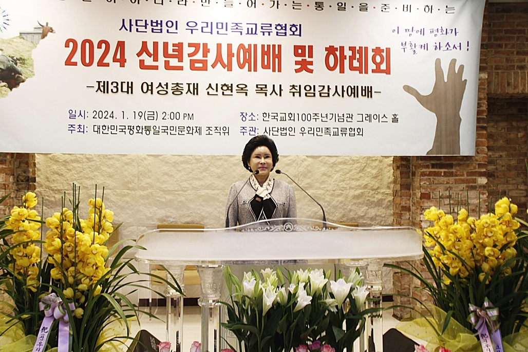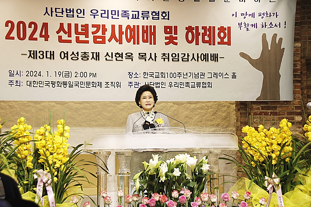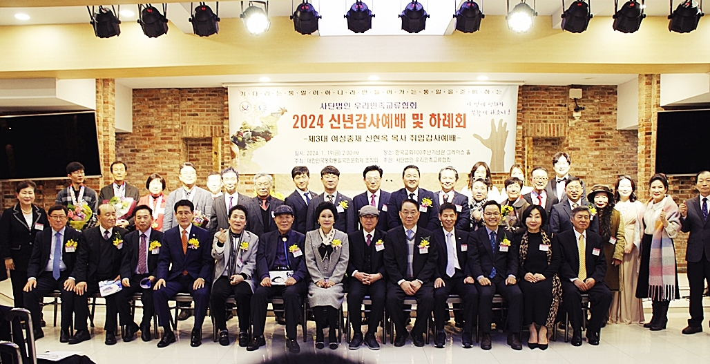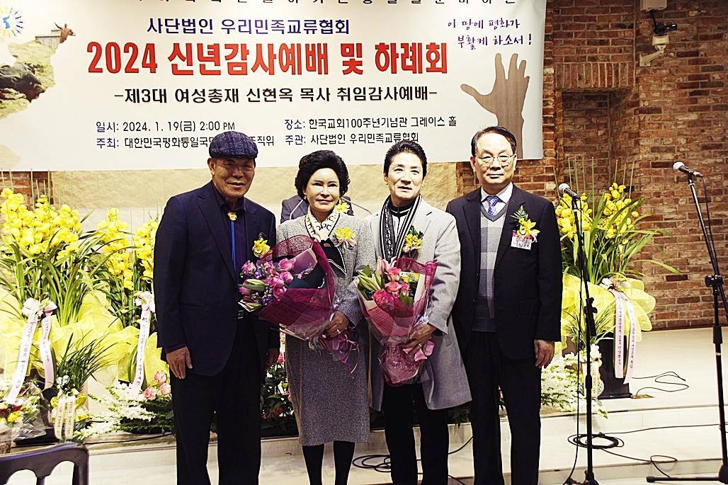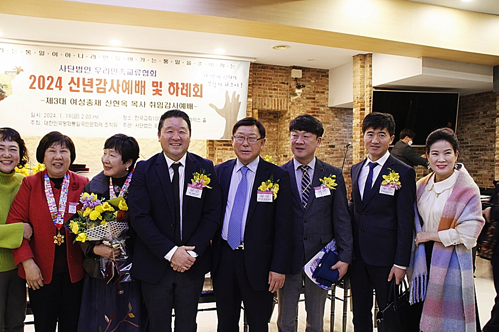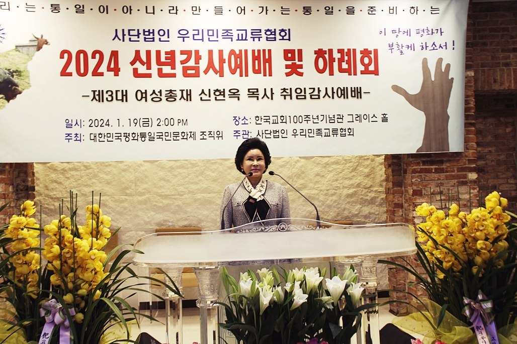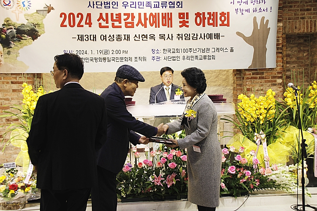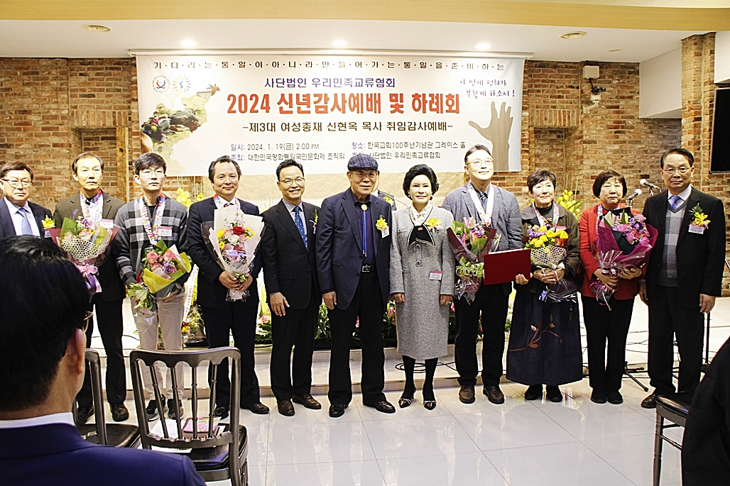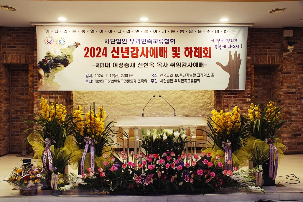 (사)우리민족교류협회(이사장:송기학)의 신년 감사예배와 하례회가 2024년 1월 19일 오후 2시 한국교회 100주년 기념관 1층에서 19일 오후 2시 서울 종로구 한국교회 백주년기념관 1층(종로구 대학로 3길 29)에서 실시되어 ‘2024 신년 감사예배 및 제3대 여성 총재 신현옥 목사 취임 감사예배를 드렸다.