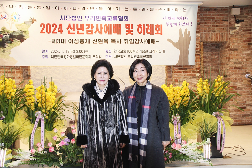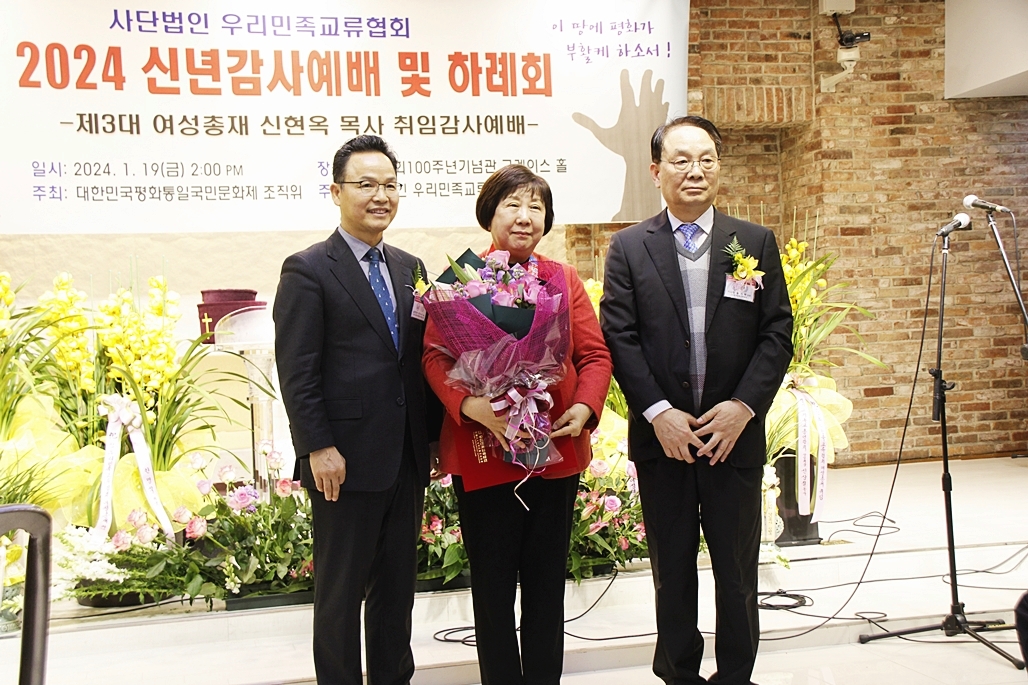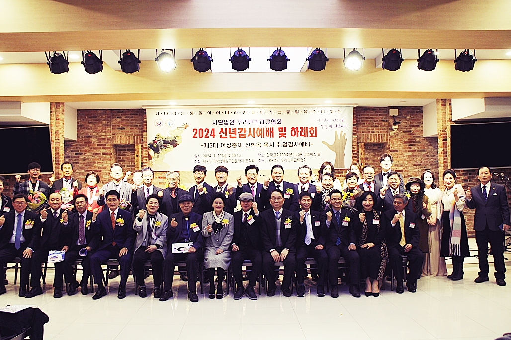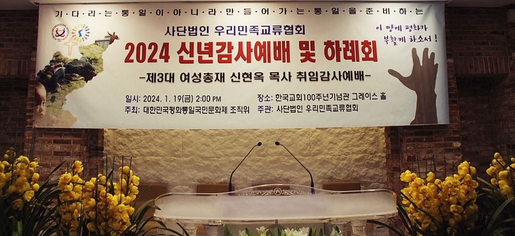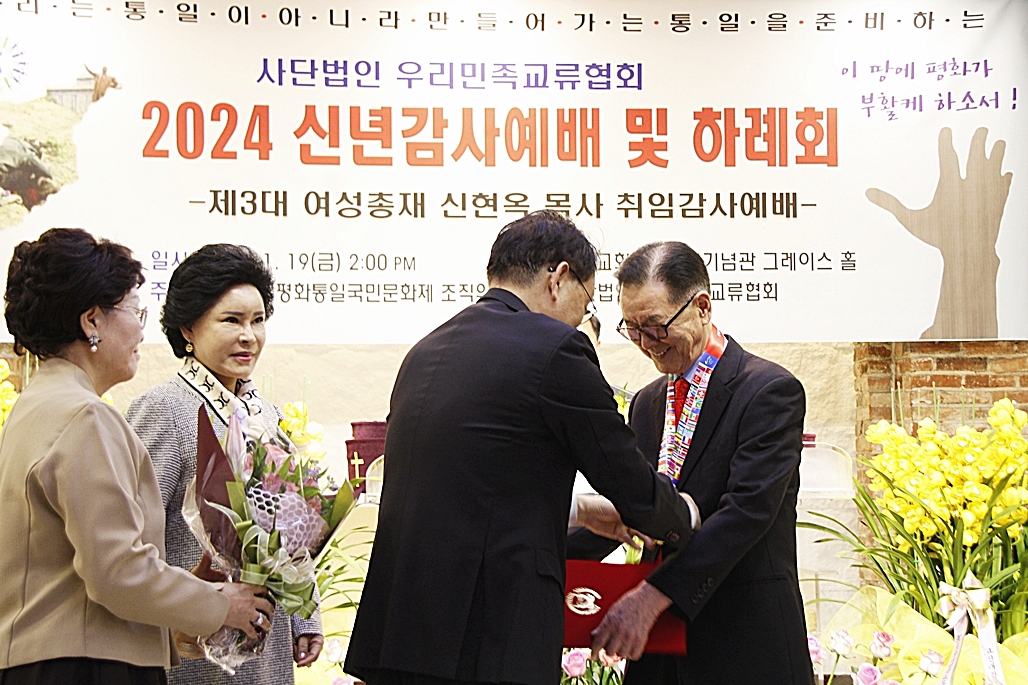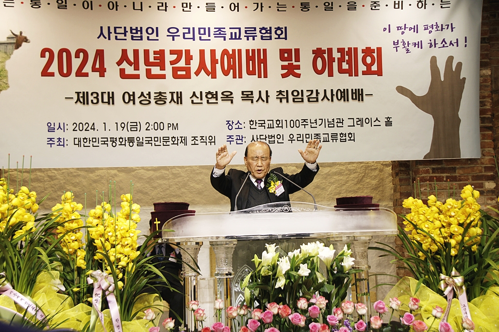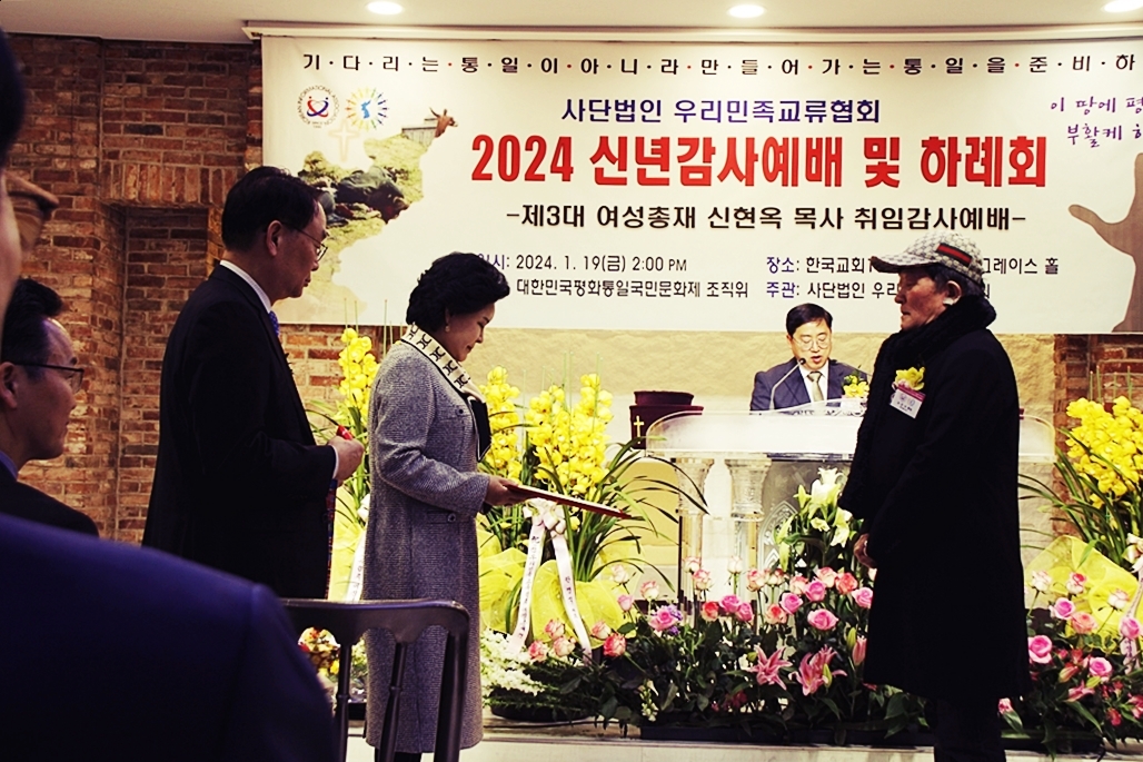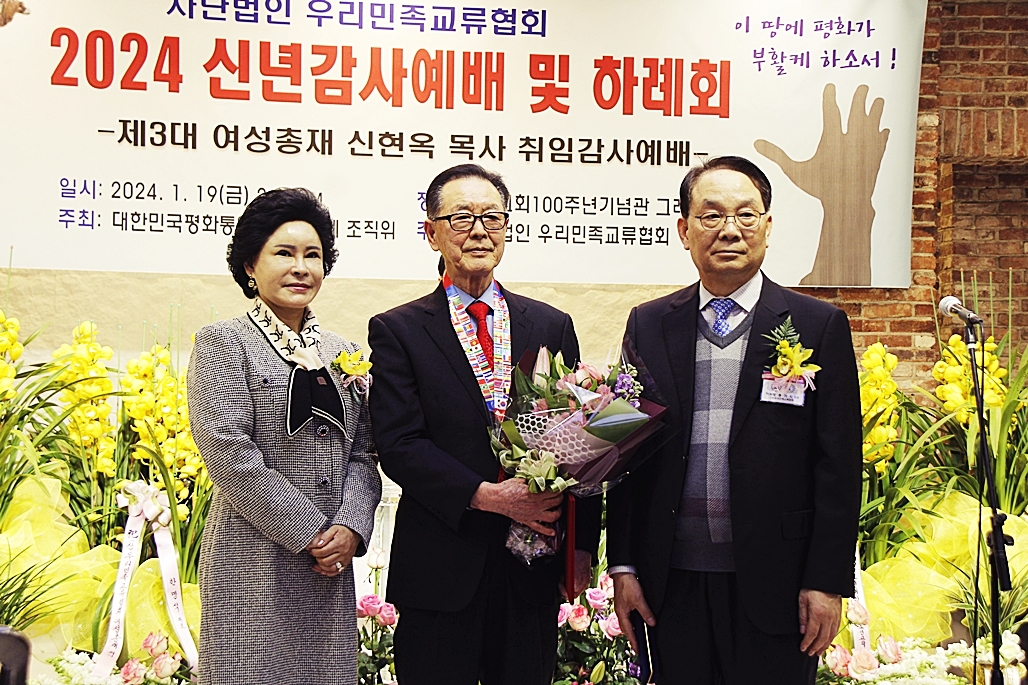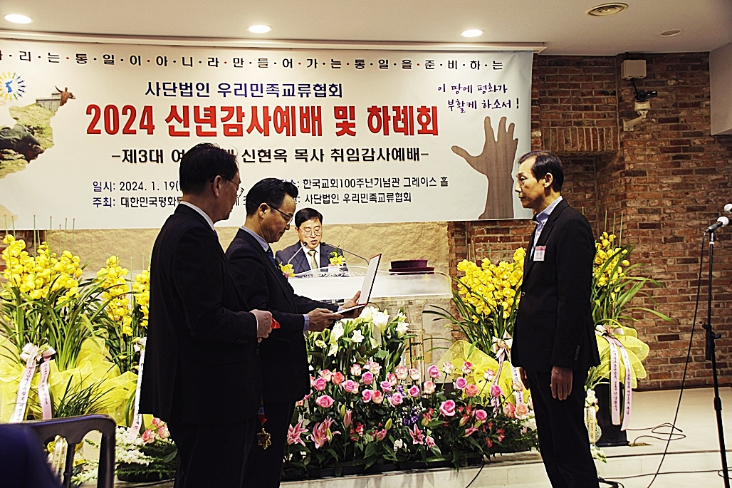(사)우리민족교류협회(이사장:송기학)의 신년 감사예배와 하례회가 2024년 1월 19일 오후 2시 한국교회 100주년 기념관 1층에서 19일 오후 2시 서울 종로구 한국교회 백주년기념관 1층(종로구 대학로 3길 29)에서 실시되어 ‘2024 신년 감사예배 및 제3대 여성 총재 신현옥 목사 취임 감사예배를 드렸다.