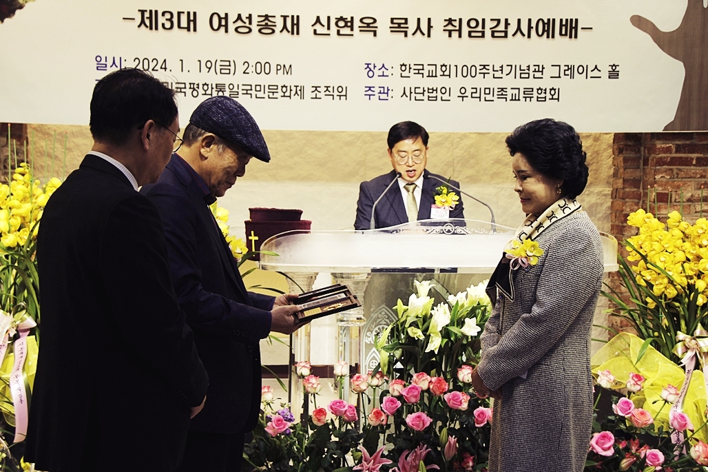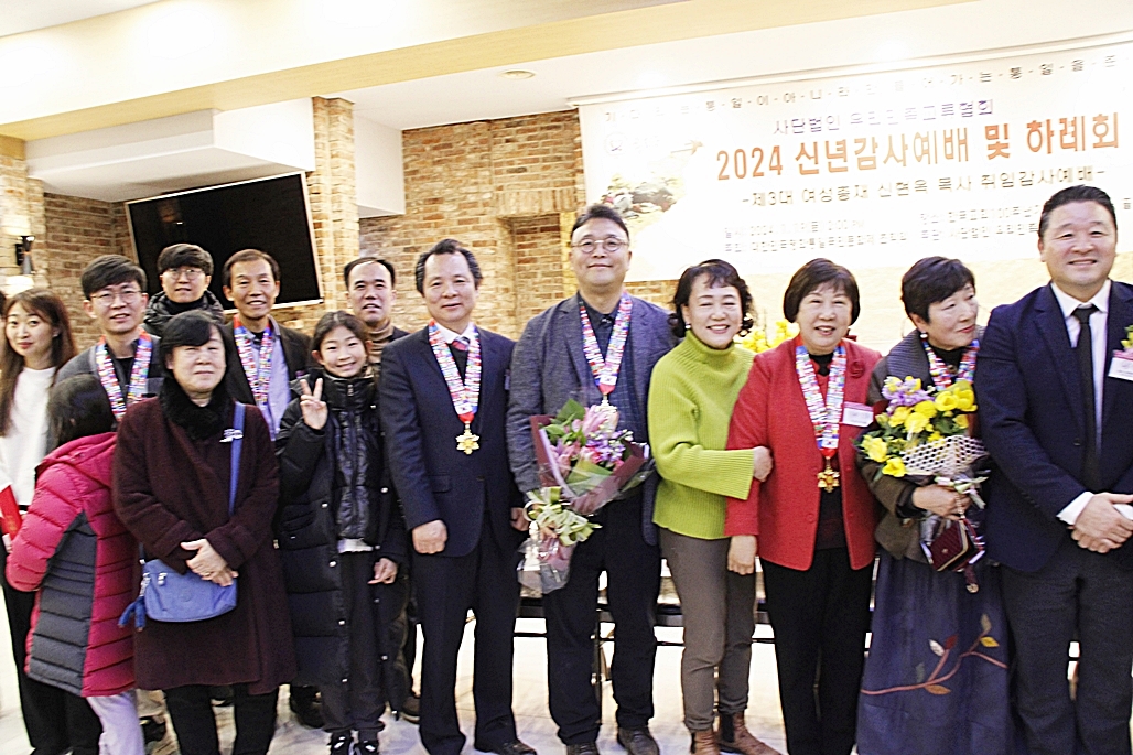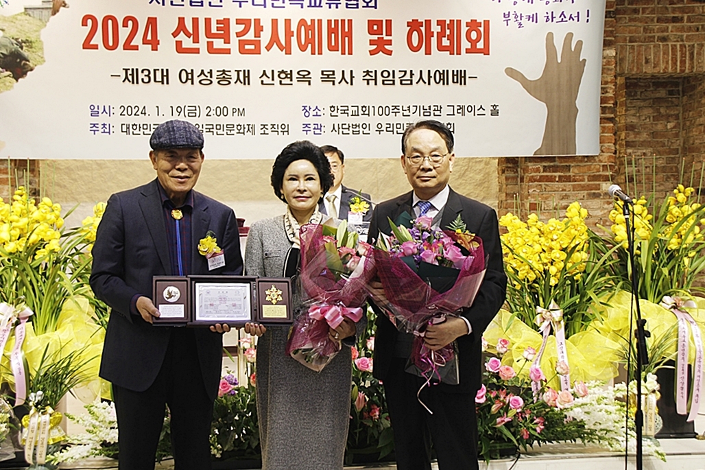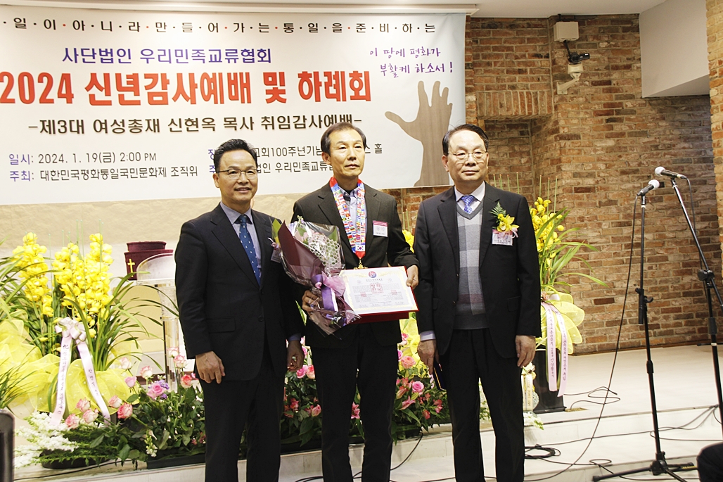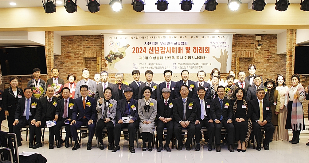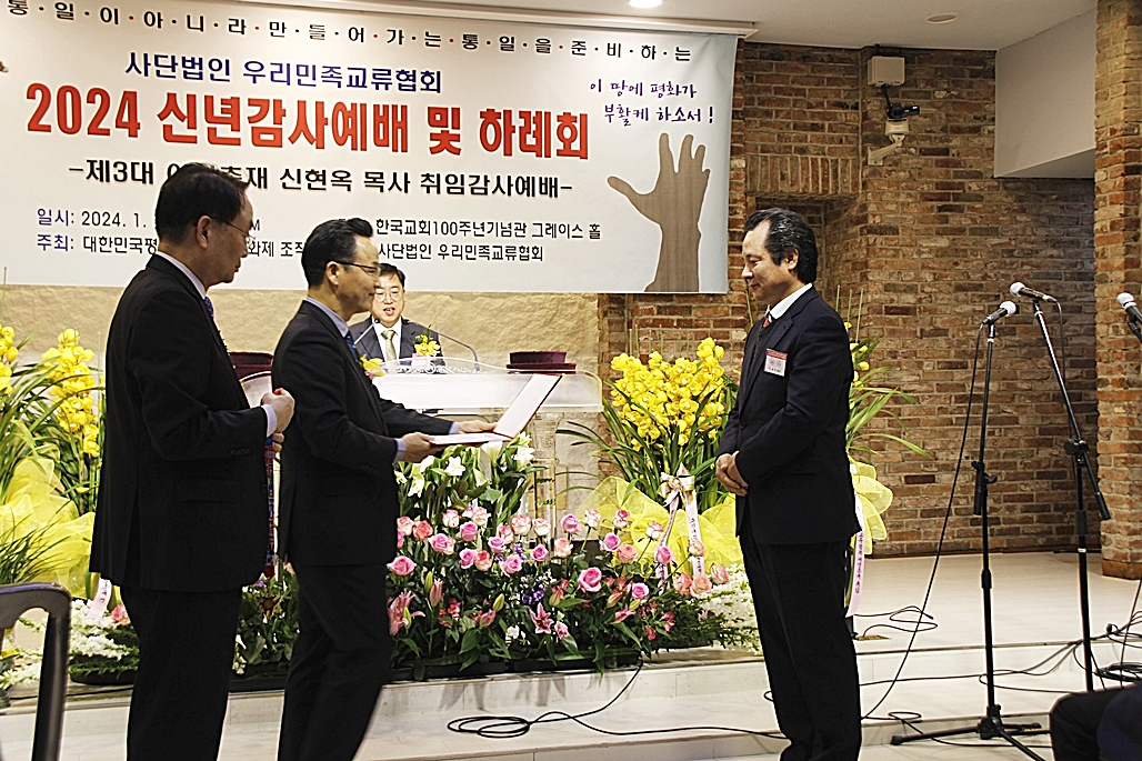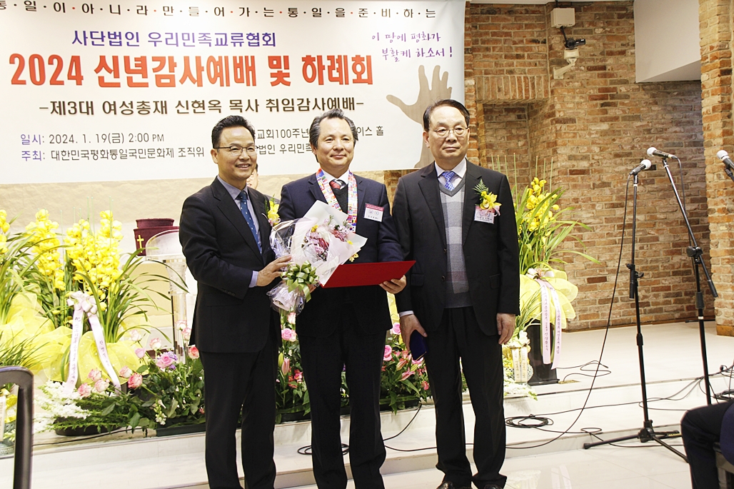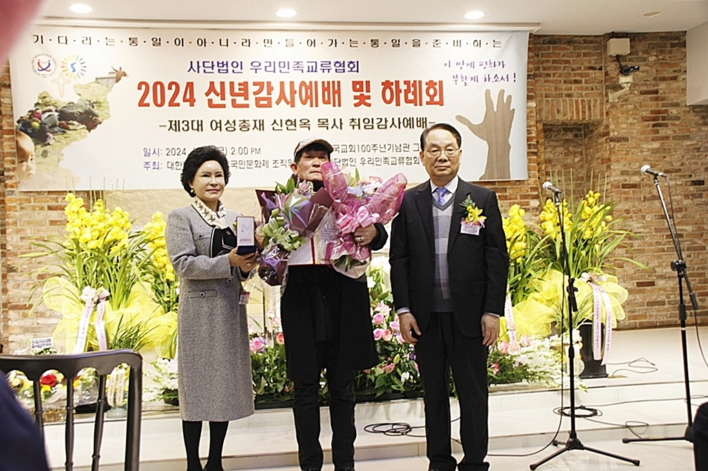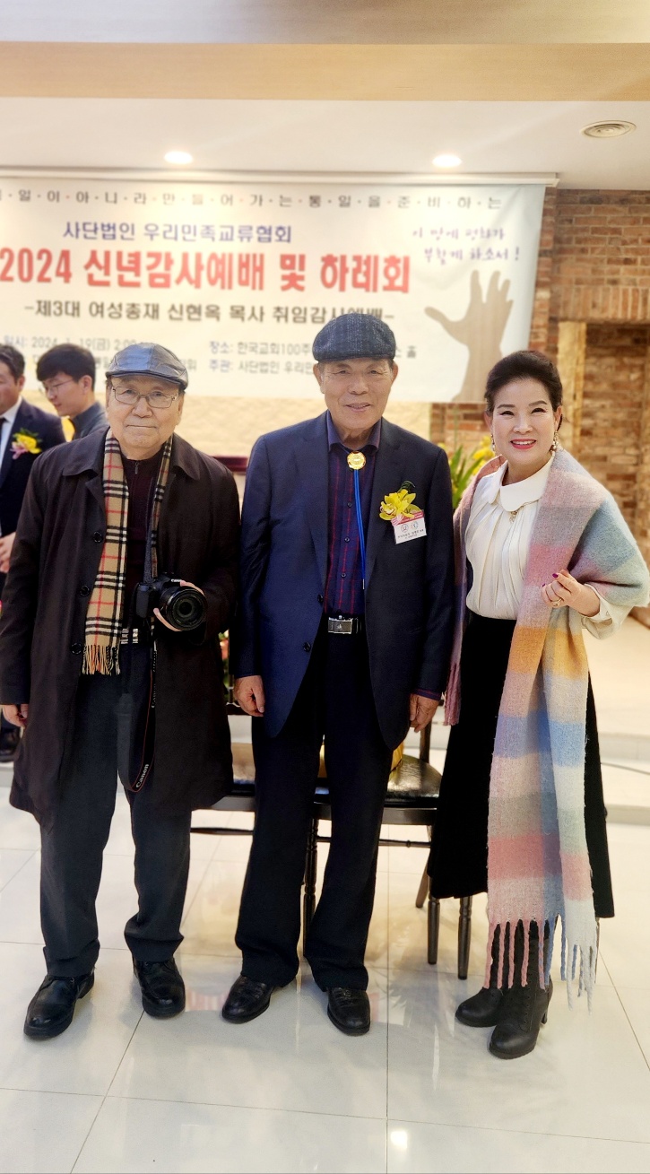 (사)우리민족교류협회(이사장:송기학)의 신년 감사예배와 하례회가 2024년 1월 19일 오후 2시 한국교회 100주년 기념관 1층에서 19일 오후 2시 서울 종로구 한국교회 백주년기념관 1층(종로구 대학로 3길 29)에서 실시되어 ‘2024 신년 감사예배 및 제3대 여성 총재 신현옥 목사 취임 감사예배를 드렸다.