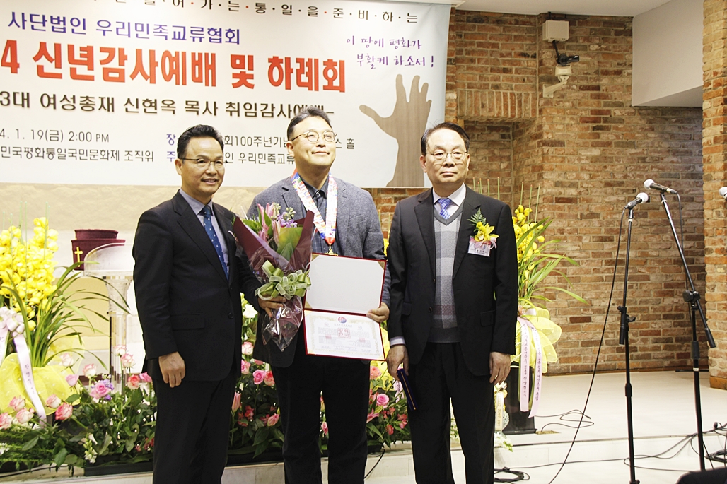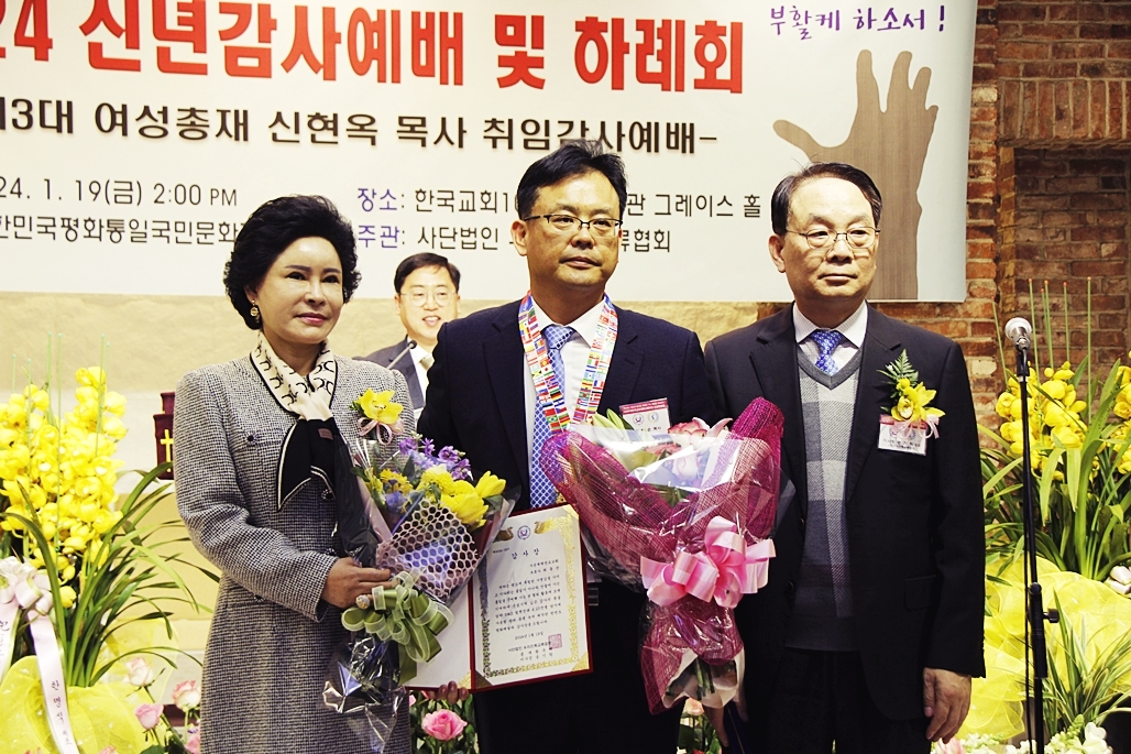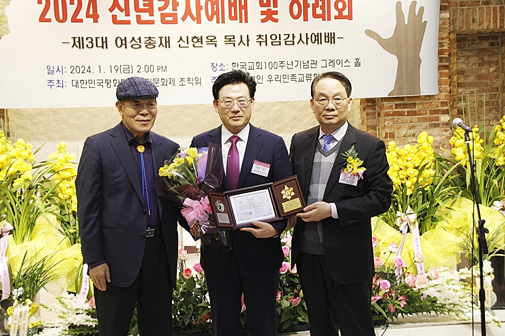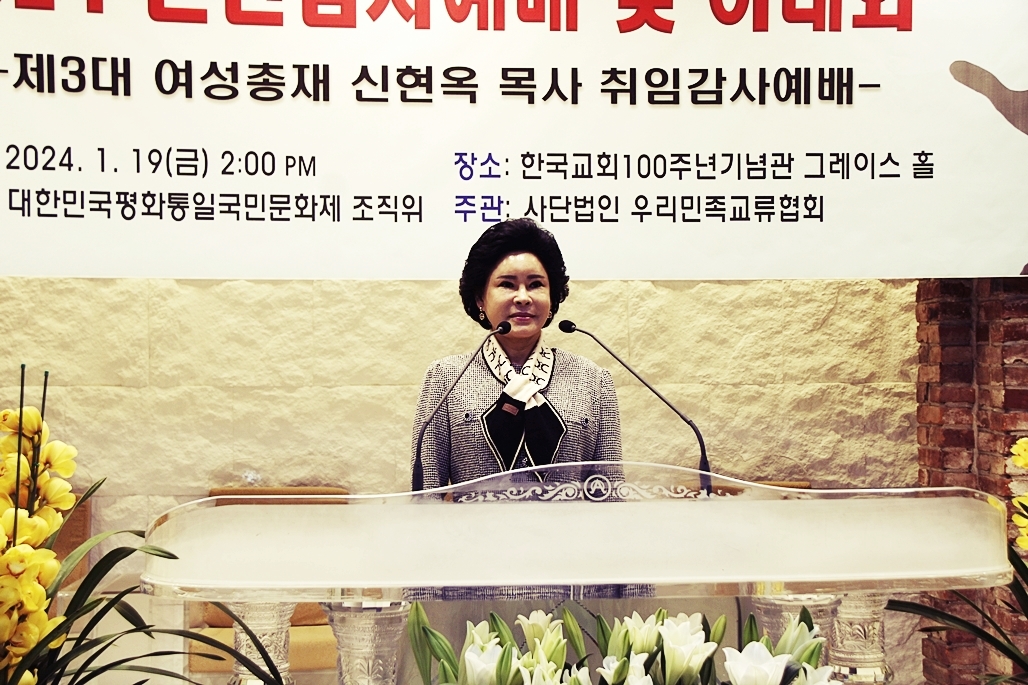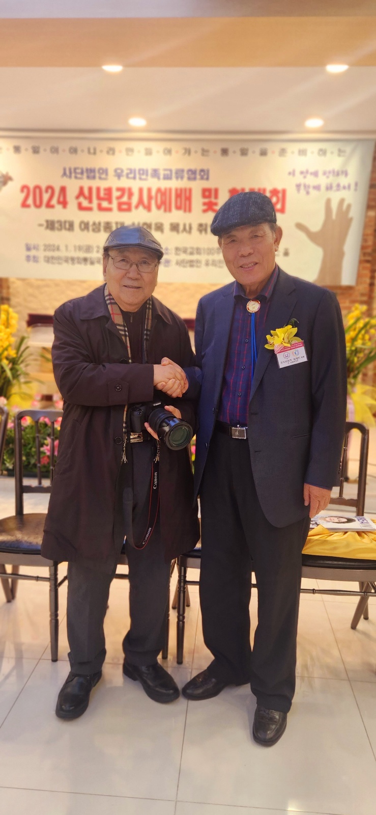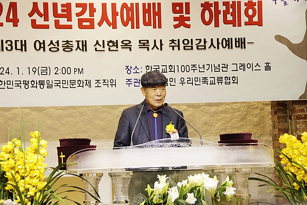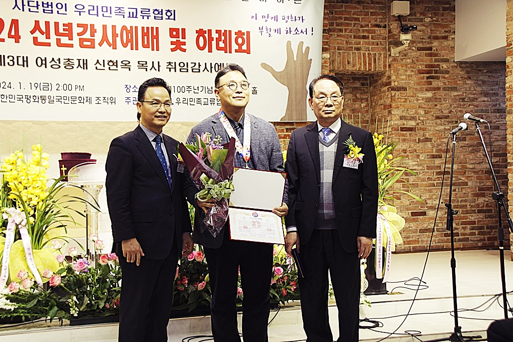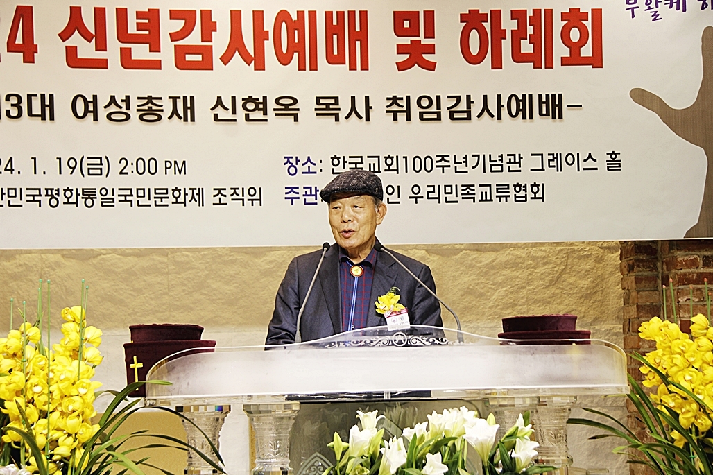 (사)우리민족교류협회(이사장:송기학)의 신년 감사예배와 하례회가 2024년 1월 19일 오후 2시 한국교회 100주년 기념관 1층에서 19일 오후 2시 서울 종로구 한국교회 백주년기념관 1층(종로구 대학로 3길 29)에서 실시되어 ‘2024 신년 감사예배 및 제3대 여성 총재 신현옥 목사 취임 감사예배를 드렸다.