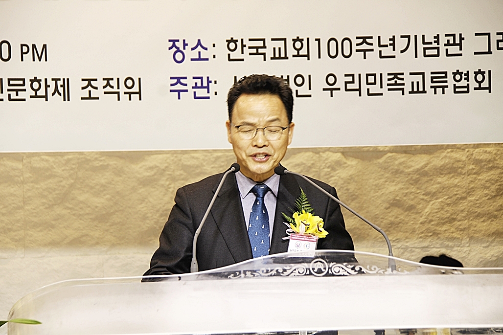 이어서 환영사에서 송기학 당 협회 이사장은 “오랜 분단의 역사속에서 급변해 가는 국제 정세 속에서 남북한을 비롯한 세계 모든 동포가 협회를 창립한 이래 적극적인 교류를 통해 민족문화를 계승 발전시켜 왔다. 앞으로도 가일층 기도하며 노력하여 국내외 모든 사람이 함께 참여하여 국민화합을 통한 사회통합과 민족통일의 길을 열자”며 환영사를 대하였다.