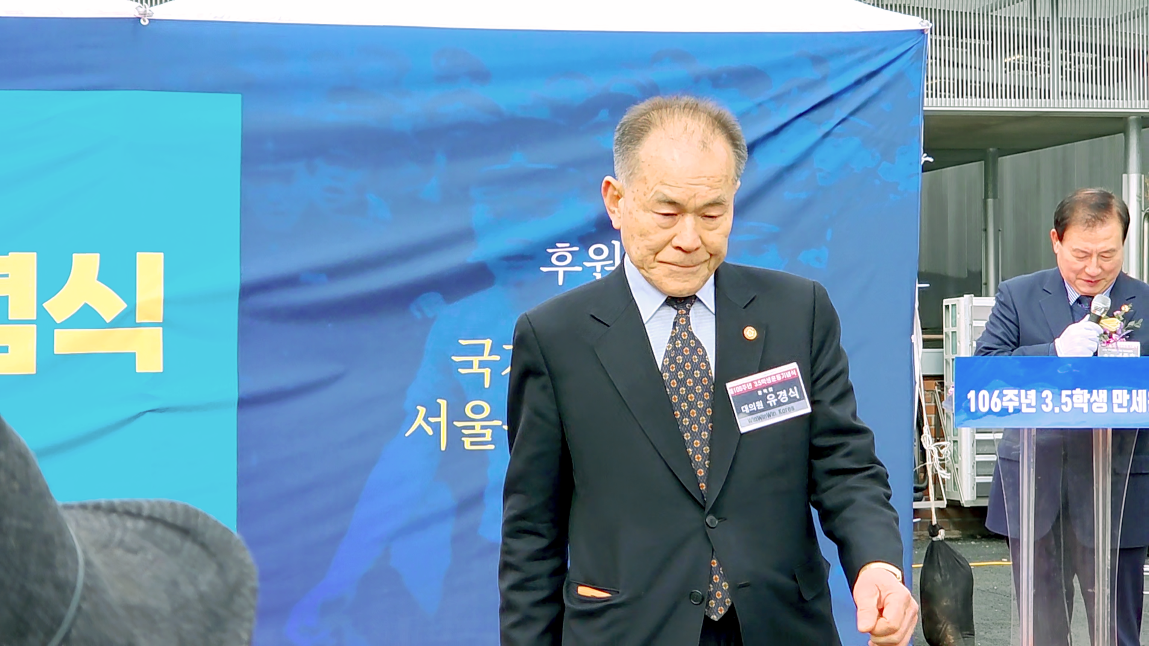 다음 기념사는 이한선 박사(3.5학생항일 만세운동 참여학교 대표/고려대학교 교우회 상임이사)로서 나이가 90세라고 처음으로 밝혀서 정정한 모습에 모두 놀라서 감탄하였다. 3.5학생항일만세 운동 실황을 잘 설명해 주시어 박수를 보낸다.